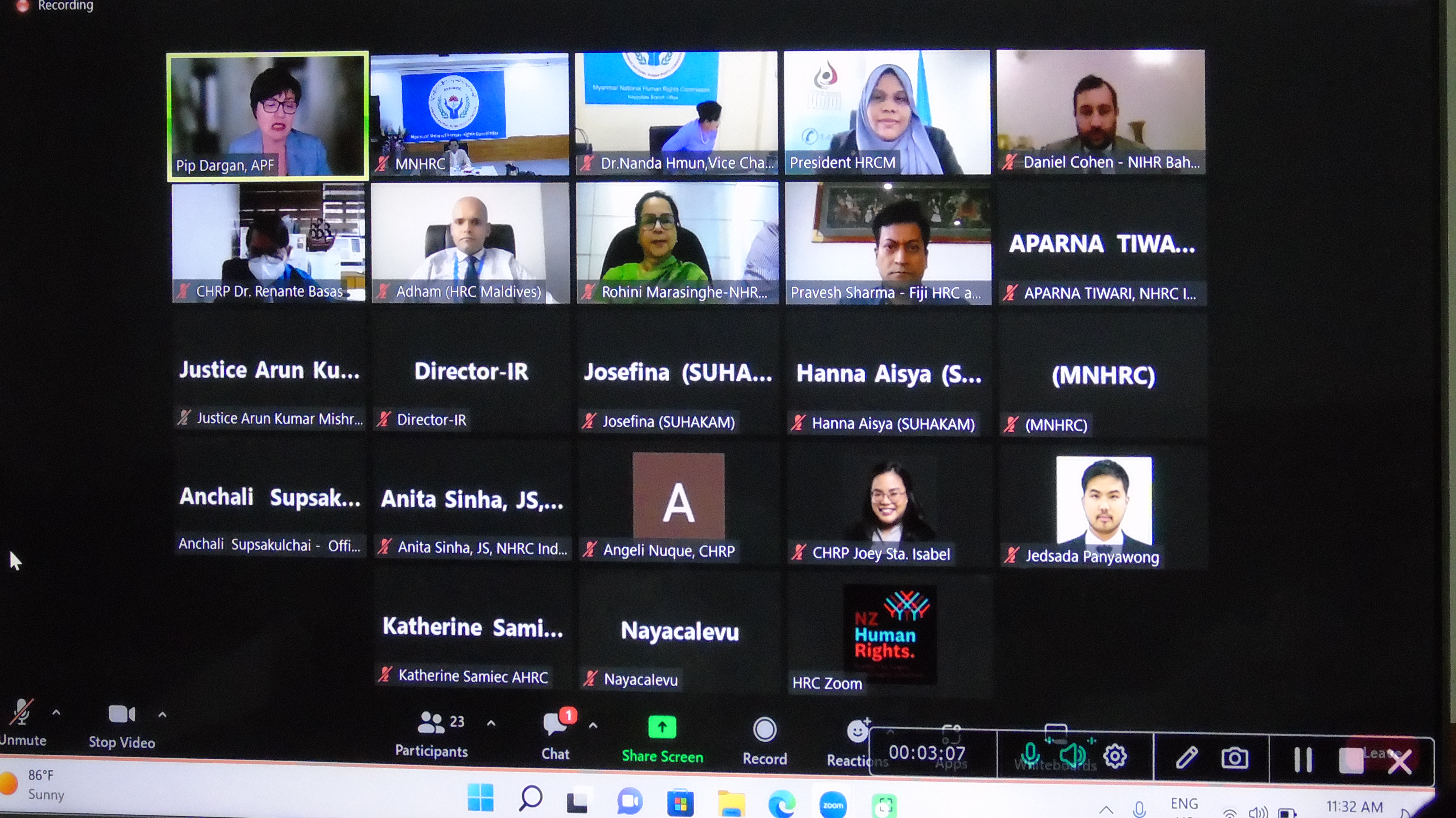 ထို့နောက် ဖိလစ်ပိုင်နိုင်ငံ အမျိုးသား လူ့အခွင့်အရေးကော်မရှင်မှ ဘာသာရပ်ဆိုင်ရာ ညွှန်ကြားရေးမှူး Dr.Renante Basas ၊ မော်လ်ဒစ်(ဗ်) လူ့အခွင့်အရေး ကော်မရှင်ဥက္ကဋ္ဌ Ms. Mariyam Muna ၊ အိန္ဒိယနိုင်ငံ လူ့အခွင့်အရေး ကော်မရှင်ဥက္ကဋ္ဌ Mr. Justice Arun Mishra နှင့် APF မှ အကြံပေးပုဂ္ဂိုလ် Mr. Romulo Nayacalevu တို့က နိုင်ငံအလိုက်ရာသီ ဥတုပြောင်းလဲမှုကြောင့် ထိခိုက်နစ်နာဆုံးရှုံးမှုများနှင့် ရာသီဥတု ပြောင်းလဲမှုဆိုင်ရာဆောင်ရွက်နေမှုများ၊ ရာသီဥတုပြောင်းလဲမှုဆိုင်ရာ ဥပဒေ၊ မူဝါဒချမှတ်ရေး ကိစ္စရပ်များ၊ အရပ်ဘက်အဖွဲ့ အစည်းများနှင့် အမျိုးသားလူ့အခွင့်အရေးအဖွဲ့အစည်းများ ပါဝင် ပူးပေါင်းဆောင်ရွက်ရေး ကိစ္စရပ်များ၊ IGM Project ဆိုင်ရာကိစ္စရပ်များ၊ ရှေ့ဆက်ဆောင်ရွက်မည့် အခြေအနေနှင့် အခွင့်အလမ်းများကိုတင်ပြဆွေးနွေးကြသည်။