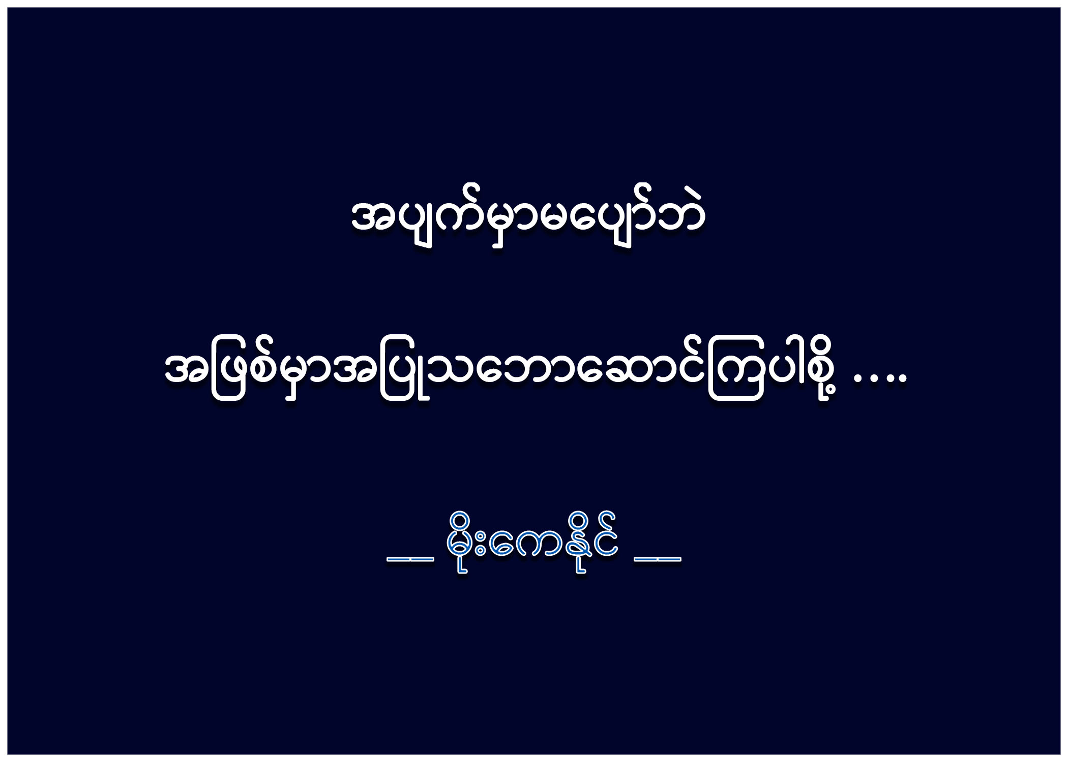 ဒါကြောင့် ကျွန်တော်တို့အားလုံး အပျက်သဘောမှာဝမ်းနည်းမနေဘဲ ၊ ပျော်မနေ ကြ၊ ရပ်တန့်မနေကြဘဲ ဖြစ်နေတဲ့အဖြစ်သဘောလေးတွေကို အပြုသဘောရှာကြံပြီး ကောင်းသောတည်ဆောက်သူတွေ ဖြစ်ကြရလေအောင် ကြိုးစားကြပါစို့ဟူ၍ ရေးသား တင်ပြလိုက်ရပါတယ်....။