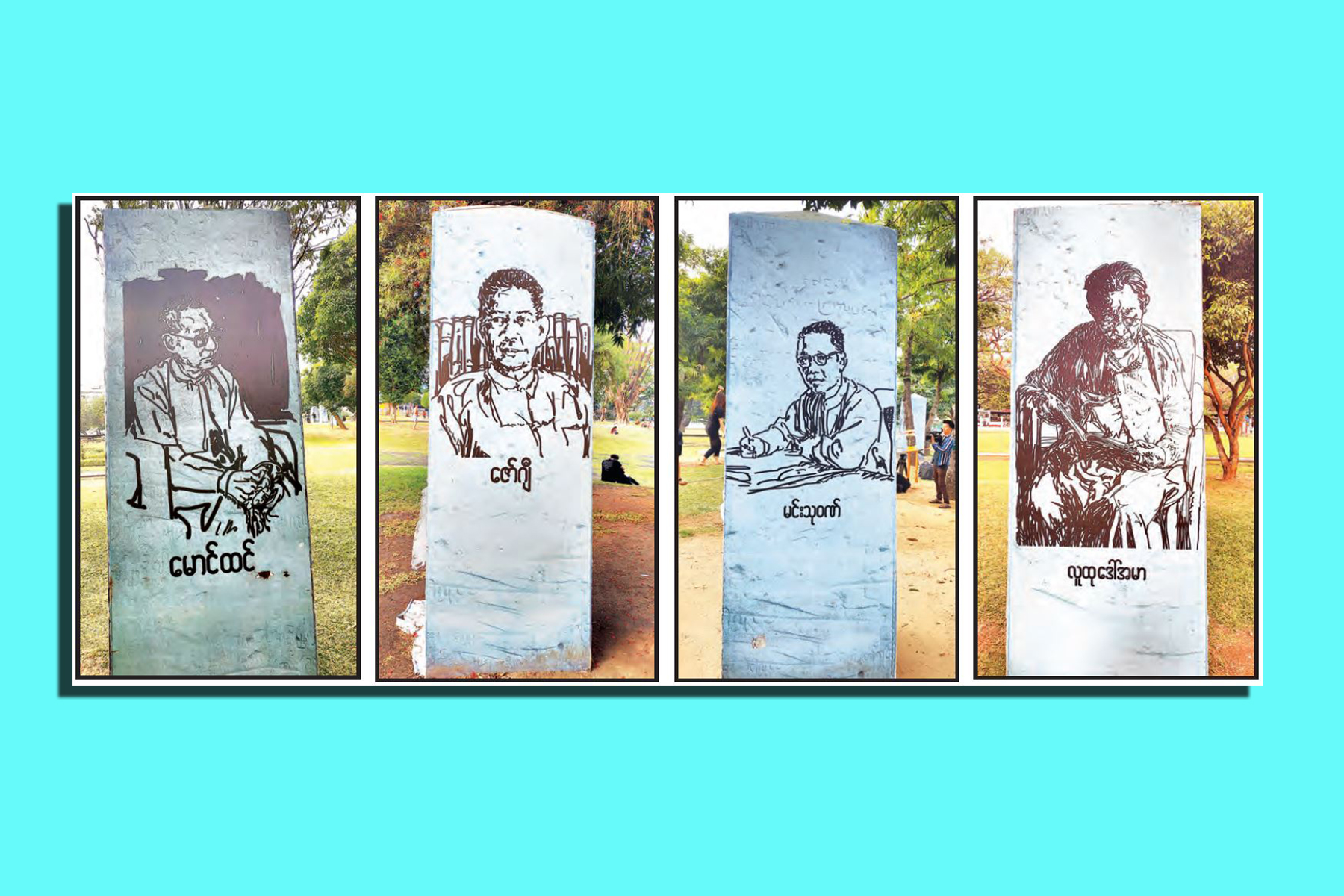 ပန်းခြံအတွင်း ကုန်းမြင့်အရိပ်အာဝါသရှိသော နှစ်နေရာတွင် ဆရာ သိပ္ပံမောင်ဝ၊ ဆရာဇော်ဂျီ၊ ဆရာမင်းသုဝဏ်၊ ဆရာဒေါင်းနွယ်ဆွေ၊ ဆရာ တင်မိုး၊ ဆရာဒဂုန်တာရာ၊ ဆရာမြသန်းတင့်၊ ဆရာဗန်းမော်တင်အောင်၊ ဆရာမ လူထုဒေါ်အမာ၊ ဆရာမောင်ထင်တို့၏ မင်ခြစ်ပုံတူ၊ ကိုယ်ရေး အကျဉ်း၊ စာကဗျာ ကောက်နုတ်ချက်များကို တွေ့ရဖတ်ရသည်။ တန်ဖိုးကြီးလှပေစွ၊ မြန်မာ့စာပေလောက၏ မီးရှူးတန်ဆောင်ကြီးများ ဖြစ်ကြသည်။