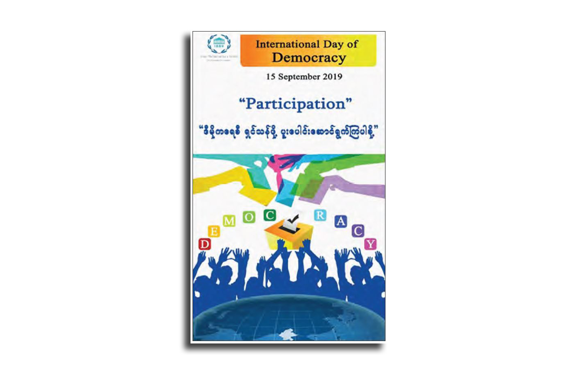 သို့ဖြစ်ရာ ၂၀၁၉ ခုနှစ် အပြည်ပြည်ဆိုင်ရာ ဒီမိုကရေစီနေ့၏ (Participation) “ဒီမိုကရေစီရှင်သန်ဖို့ ပူးပေါင်း ဆောင်ရွက်ကြပါစို့” ဆောင်ပုဒ်နှင့်အညီ ယခုနှစ်ကျင်းပမည့် အပြည်ပြည်ဆိုင်ရာ ဒီမိုကရေစီနေ့ အခမ်းအနားမှတစ်ဆင့် ပြည်သူလူထုအတွင်း ဒီမိုကရေစီကျင့်စဉ်များ ပိုမိုရှင်သန်ရေး ပူးပေါင်းဆောင်ရွက်ကြပါရန် တိုက်တွန်းအပ်ပါသည်။ ။