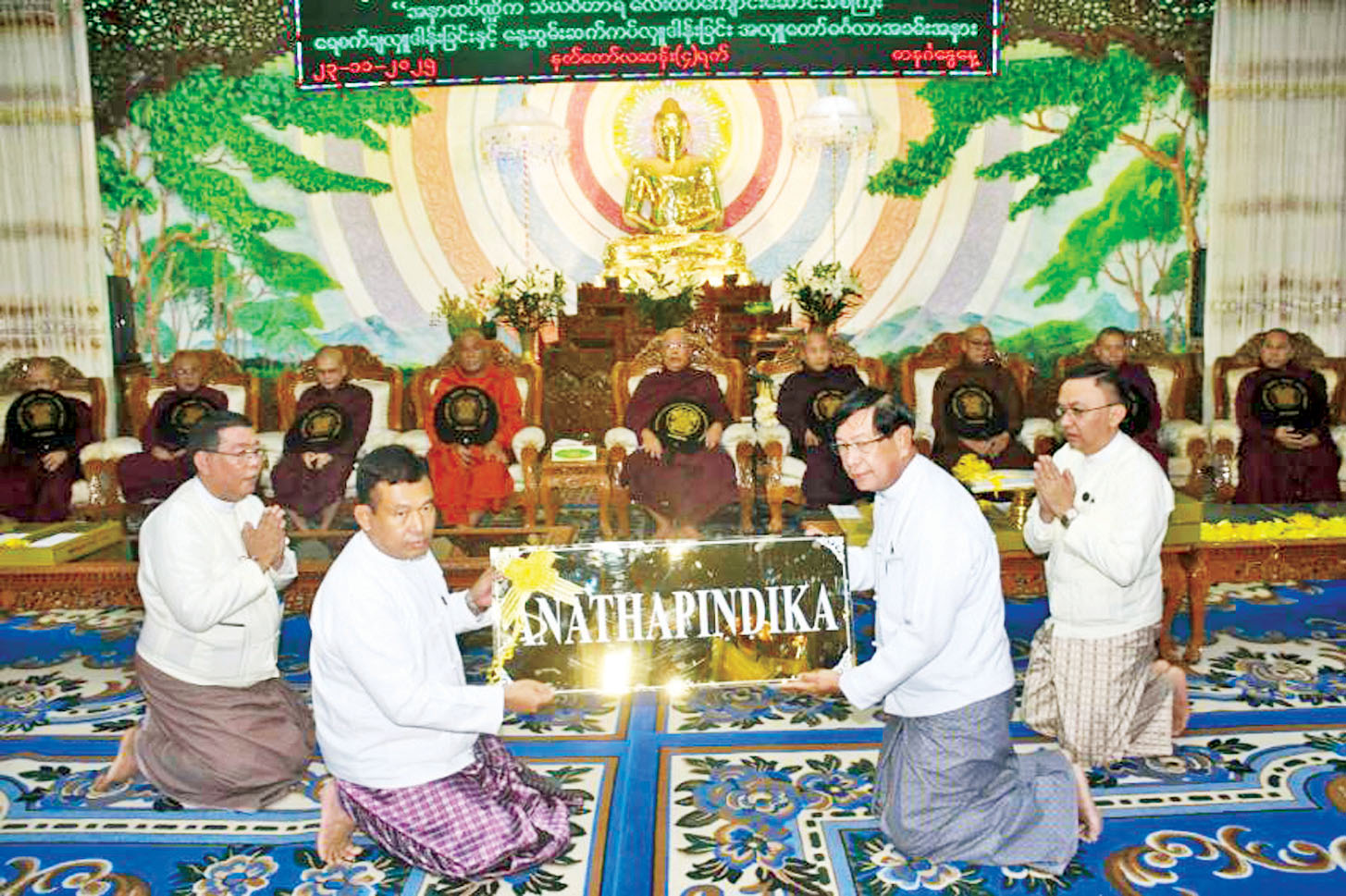 ထို့နောက် ပါမောက္ခချုပ်ဆရာတော်က အလှူရှင်များကိုယ်စား တိုင်းဒေသကြီးဝန်ကြီးချုပ်နှင့် ပင်မကျောင်းဆောင်သစ် ဦးဆောင်မတည်အလှူရှင်တို့အား တက္ကသိုလ်ပုံ ကျောက်စီပန်းချီကား ပေးအပ်ချီးမြှင့်ပြီး တိုင်းဒေသကြီးဝန်ကြီးချုပ်က အလှူရှင်များကိုယ်စား အနာထပိဏ္ဍိကသံဃဝိဟာရ  လေးထပ်ကျောင်းဆောင်သစ် ကမ္ပည်းမော်ကွန်းပြား ဆိုင်းဘုတ်ကို အမြဲတမ်းအတွင်းဝန်ထံ    ပေးအပ်လှူဒါန်း၍ လှူဒါန်းမှုအစုစုတို့အတွက် အနုမောဒနာတရား နာကြားခဲ့ကြောင်း သိရသည်။