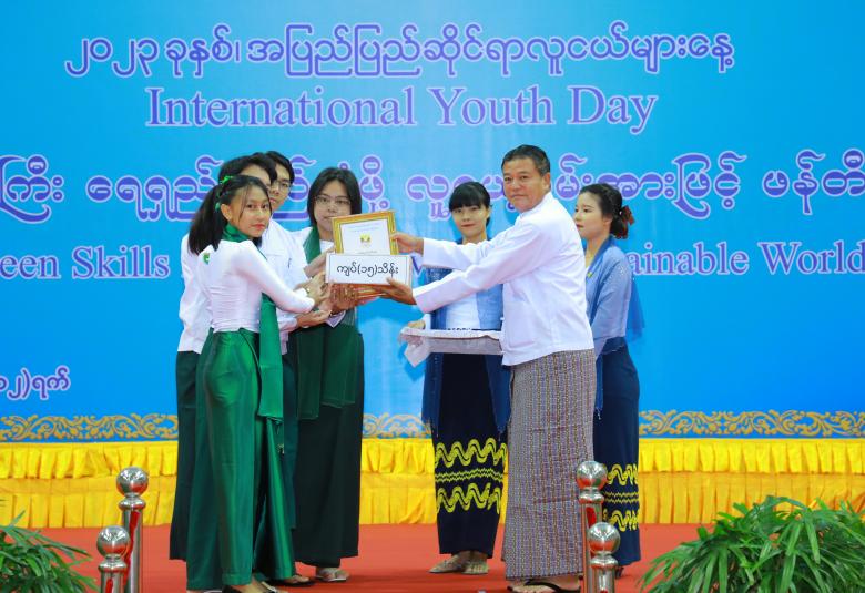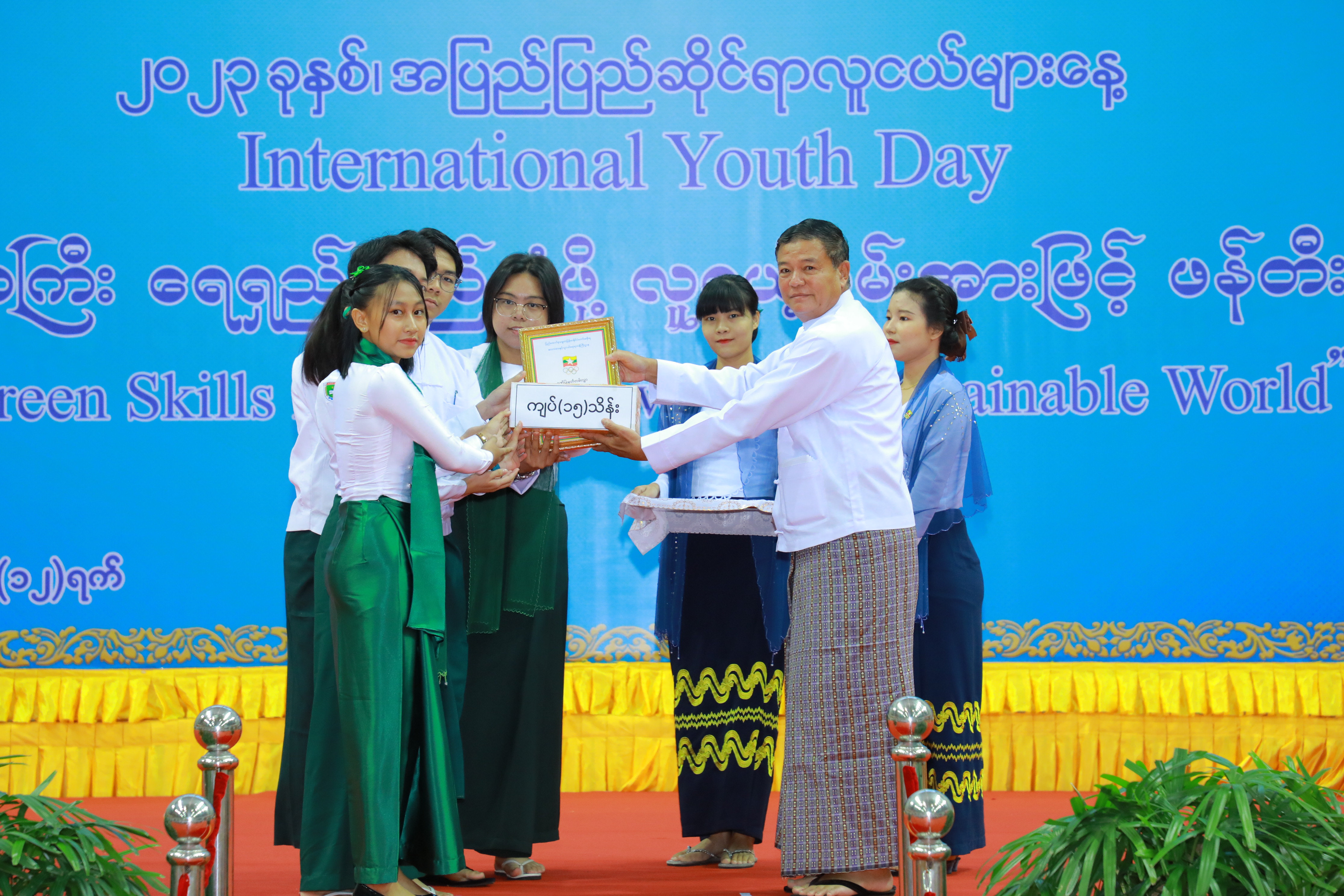 လူငယ်များ ဘက်စုံဖွံ့ဖြိုးတိုးတက်စေရေးအတွက် အကောင်အထည်ဖော် ဆောင်ရွက်ရာတွင် ဦးဆောင်ဝန်ကြီးဌာနများဖြစ်သည့် အားကစားနှင့် လူငယ်ရေးရာဝန်ကြီးဌာန၊ ပညာရေးဝန်ကြီးဌာန၊ သိပ္ပံနှင့်နည်းပညာဝန်ကြီးဌာန၊ လူမှုဝန်ထမ်း၊ ကယ်ဆယ်ရေးနှင့် ပြန်လည်နေရာချထားရေး ဝန်ကြီးဌာနများအပါအဝင် ပြည်ထောင်စုဝန်ကြီးဌာနများ၊ တိုင်းဒေသကြီးနှင့် ပြည်နယ် အစိုးရအဖွဲ့များနှင့်အတူ ပြည်သူတစ်ရပ်လုံးက အမျိုးသားရေးအသိဖြင့် ဝိုင်းဝန်းပူးပေါင်း ဆောင်ရွက်သွားကြရမည်ဖြစ်ကြောင်း၊ ယနေ့အခမ်းအနားတွင် ထူးချွန်သည့် နိုင်ငံ့ဂုဏ်ဆောင်လူငယ် မောင်/မယ်များကို ဂုဏ်ပြုဆုငွေများ ချီးမြှင့်ပေးသွားမည် ဖြစ်ကြောင်း၊ လူငယ်များဘက်စုံဖွံ့ဖြိုး တိုးတက်ရေးလုပ်ငန်းများကို ဘက်ပေါင်းစုံမှ ဟန်ချက်ညီညီ ဝိုင်းဝန်ပူးပေါင်းဆောင်ရွက်ခြင်းဖြင့် အနာဂတ်တွင် တိုင်းချစ်ပြည်ချစ်စိတ်ရှိပြီး စိတ်ဓာတ်စည်းကမ်း ကောင်းမွန်သည့် လူကောင်းလူတော်များ မွေးထုတ်ပေးနိုင်မည်ဖြစ်ကြောင်း၊ လူငယ်များ၏ စွမ်းပကားဖြင့် လူမှုစီးပွားဘဝ သာယာဖွံ့ဖြိုးတိုးတက်သော အနာဂတ်လူ့ဘောင်အဖွဲ့အစည်းအား ဖန်တီးပုံဖော်နိုင်မည်ဖြစ်ကြောင်း ပြောကြားသည်။