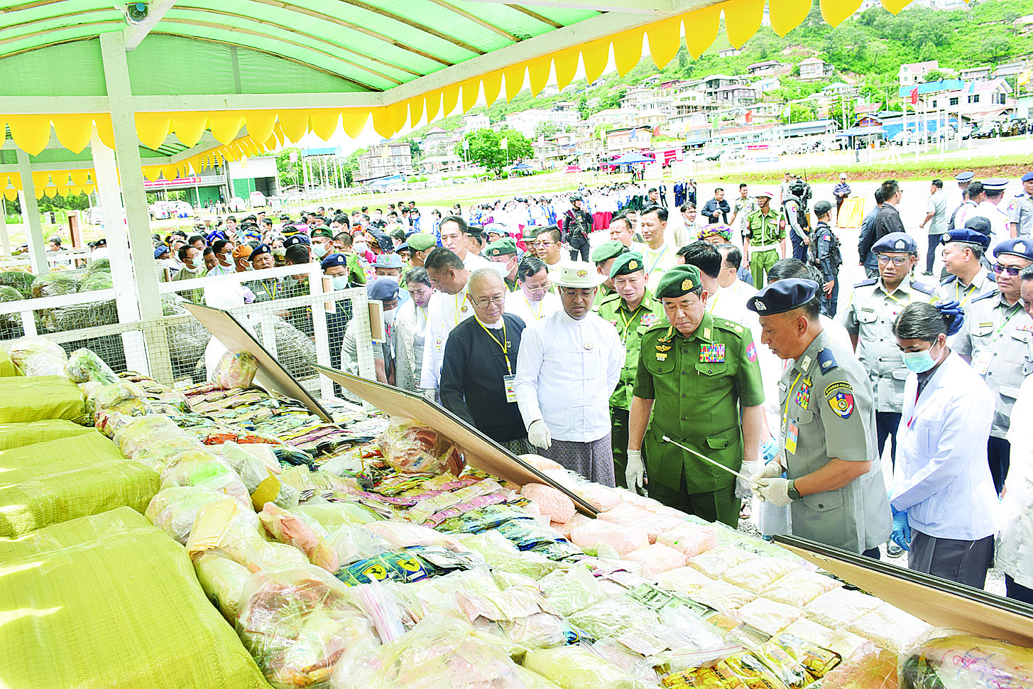 အပြည်ပြည်ဆိုင်ရာ မူးယစ်ဆေးဝါးအလွဲသုံးမှုနှင့် တရားမဝင်ရောင်းဝယ်မှုတိုက်ဖျက်ရေးနေ့ အထိမ်းအမှတ် အခမ်းအနားများကို ယနေ့တွင် နေပြည်တော်ကောင်စီနယ်မြေ၊ တိုင်းဒေသကြီး/ ပြည်နယ်များတွင် ကျင်းပပြီး တောင်ကြီး၊ ရန်ကုန်နှင့် မန္တလေးမြို့တို့တွင် တစ်နှစ်တာကာလအတွင်း ဖမ်းဆီးရမိမူးယစ်ဆေးဝါးများ၊ ဓာတုပစ္စည်းများ ဖျက်ဆီးခြင်းကို ကျန်းမာရေးဝန်ကြီးဌာနမှ ထုတ်ပြန်ထားသည့် ကိုဗစ်-၁၉ ရောဂါဆိုင်ရာ ညွှန်ကြားချက်များနှင့်အညီ ကျင်းပကာ မူးယစ်ဆေးဝါးတားဆီးနှိမ်နင်းရေးလုပ်ငန်းများတွင် ထူးချွန်စွာ စွမ်းစွမ်းတမံဆောင်ရွက်ခဲ့ကြသူများကို ဆုများချီးမြှင့်ကြသည်။