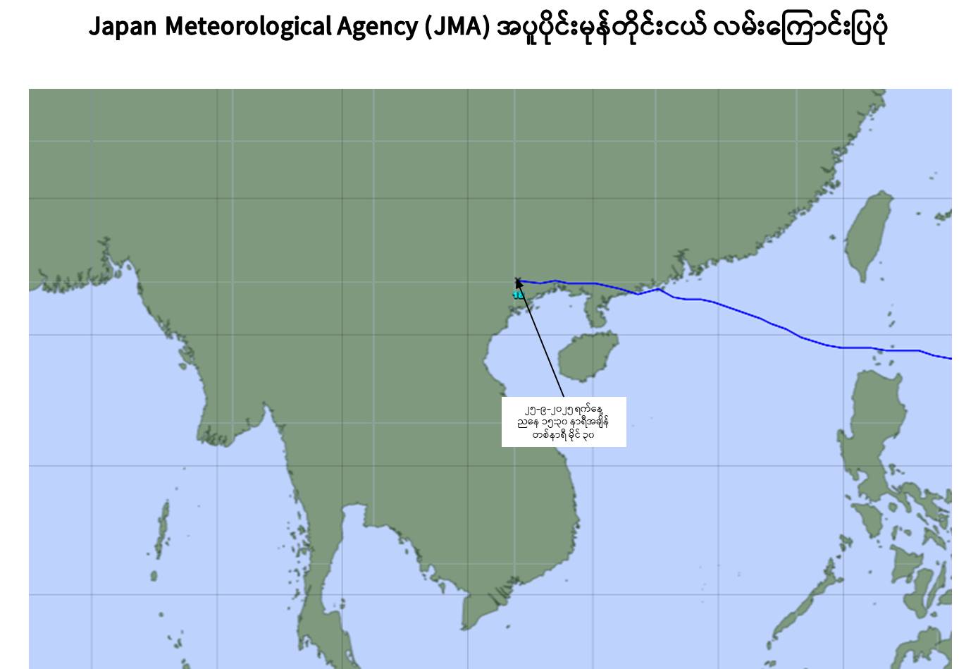 ယနေ့မြန်မာစံတော်ချိန် ၁၅:၃၀ နာရီအချိန် တိုင်းထွာချက်များအရ တရုတ်နိုင်ငံတောင်ပိုင်း၊ ကွမ်ရှီးပြည်နယ်တောင်ပိုင်းဒေသများကို ဖြတ်ကျော်ခဲ့သော အပူပိုင်းမုန်တိုင်း “ရာဂါဆာ” (RAGASA) သည် အနောက်ဘက်သို့ရွေ့လျားခဲ့ပြီး အပူပိုင်းမုန်တိုင်းငယ်အဖြစ် အားလျော့သွားခဲ့ကာ ဗီယက်နမ်နိုင်ငံမြောက်ပိုင်းဒေသများကို ဖြတ်ကျော်လျက်ရှိပါသည်။ အဆိုပါ အပူပိုင်းမုန်တိုင်းငယ်သည် အနောက်ဘက်သို့ ဆက်လက်ရွေ့လျားနိုင်ပြီး နောက် ၂၄ နာရီအတွင်း ဗီယက်နမ်နိုင်ငံမြောက်ပိုင်းကုန်းတွင်းဒေသများကို ဆက်လက်ဖြတ်ကျော်ကာ တဖြည်းဖြည်းအားလျော့သွားမည်ဟု ခန့်မှန်းရပါသည်။