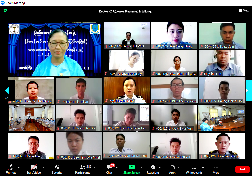 နိုင်ငံ့ဝန်ထမ်းတက္ကသိုလ် (အောက်မြန်မာပြည်) အရာထမ်းငယ်သင်တန်းအမှတ်စဉ်(၁၂၅)၏ သင်တန်းဖွင့်ပွဲအခမ်းအနားကို ယနေ့နံနက် ၉ နာရီတွင် Online Learning System ဖြင့် ကျင်းပရာ ဒုတိယပါမောက္ခချုပ်(စီမံခန့်ခွဲရေး) ဒေါ်မူမူမြင့်က သင်တန်းဖွင့်အမှာစကား ပြောကြားသည်။