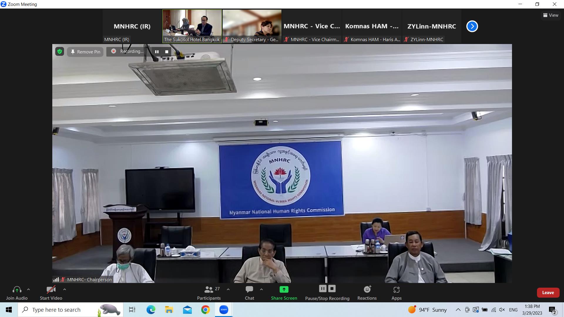 အရှေ့တောင်အာရှ အမျိုးသားလူ့အခွင့်အရေး အဖွဲ့အစည်းများဖိုရမ် (Southeast Asia National Human Rights Institutions Forum – SEANF) ၏ ပထမအကြိမ် လုပ်ငန်းအဖွဲ့ အစည်းအဝေးကို ဖိုရမ်၏ အလှည့်ကျဥက္ကဋ္ဌအဖြစ် တာဝန်ယူဆောင်ရွက် လျက်ရှိသည့် ထိုင်းနိုင်ငံ အမျိုးသားလူ့အခွင့်အရေးကော်မရှင်က မတ်၂၉ ရက်မှ ၃၀ ရက် အထိ ထိုင်းနိုင်ငံ ဘန်ကောက်မြို့၌ Hybrid format ဖြင့် ကျင်းပခဲ့ရာ မြန်မာနိုင်ငံ အမျိုးသား လူ့အခွင့်အရေးကော်မရှင်မှ ကော်မရှင်ဥက္ကဋ္ဌ ဦးလှမြင့်၊ ဒုတိယဥက္ကဋ္ဌ ဒေါက်တာနန္ဒာမွှန်း၊ ကော်မရှင်အဖွဲ့ဝင်များဖြစ်ကြသည့် ဦးပေါ်လွင်စိန်၊ ဒေါက်တာသန်းမြင့်နှင့် ဒေါက်တာ တင်မောင်မောင်သန်း၊ ကော်မရှင်ရုံး ဒုတိယညွှန်ကြားရေးမှူးချုပ်၊ နိုင်ငံတကာဆက်ဆံ ရေးဌာန ညွှန်ကြားရေးမှူးနှင့် ဝန်ထမ်းများက video conferencing System အသုံးပြု တက်ရောက်ခဲ့ကြပြီး ဖိုရမ်အဖွဲ့ဝင်များဖြစ်သည့် အင်ဒိုနီးရှားနိုင်ငံ၊ မလေးရှားနိုင်ငံ၊ ဖိလစ်ပိုင်နိုင်ငံ၊ ထိုင်းနိုင်ငံနှင့် တီမောလက်စ်တေနိုင်ငံ လူ့အခွင့်အရေး ကော်မရှင်များမှ ကိုယ်စားလှယ်များက In-person တက်ရောက်ခဲ့ကြသည်။