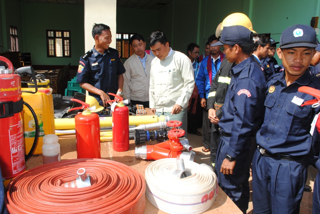 ယင်းနောက် မြို့နယ်မီးသတ်ဦးစီးဌာနမှ ခင်းကျင်းပြသထားသည့် မီးငြိမ်းသတ်ရေးဆိုင်ရာ ပစ္စည်းများနှင့် ရှာဖွေကယ်ဆယ်ရေးဆိုင်ရာ ပစ္စည်းများတို့ကို မီးသတ်ဦးစီးဌာနမှူးနှင့် ဝန်ထမ်းများတို့က လိုက်လံရှင်းလင်းပြသရာ သင်တန်းသားများမှ စိတ်ဝင်တစားကြည့်ရှု မှတ်သားခဲ့ကြသည်။