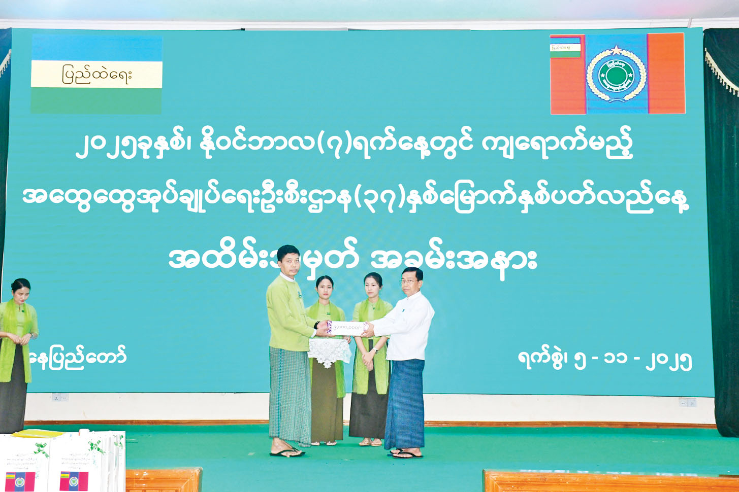 ထို့နောက် နိုင်ငံ့ဝန်ထမ်းတက္ကသိုလ် (အထက်မြန်မာပြည်)၌ ဖွင့်လှစ်သည့် အရာထမ်းငယ် အခြေခံ သင်တန်းတွင် စံပြဆုရရှိခဲ့သည့် ဝန်ထမ်းအား ဂုဏ်ပြုဆု၊ ဝန်ထမ်းများအတွက် ဝတ်စုံများနှင့် ဂုဏ်ပြုဆုငွေများ  ပေးအပ်ချီးမြှင့်ပြီး အထွေထွေအုပ်ချုပ်ရေးဦးစီးဌာန၏  သမိုင်းကြောင်းမှတ်တမ်း ဗီဒီယိုကို ကြည့်ရှုအားပေးသည်။