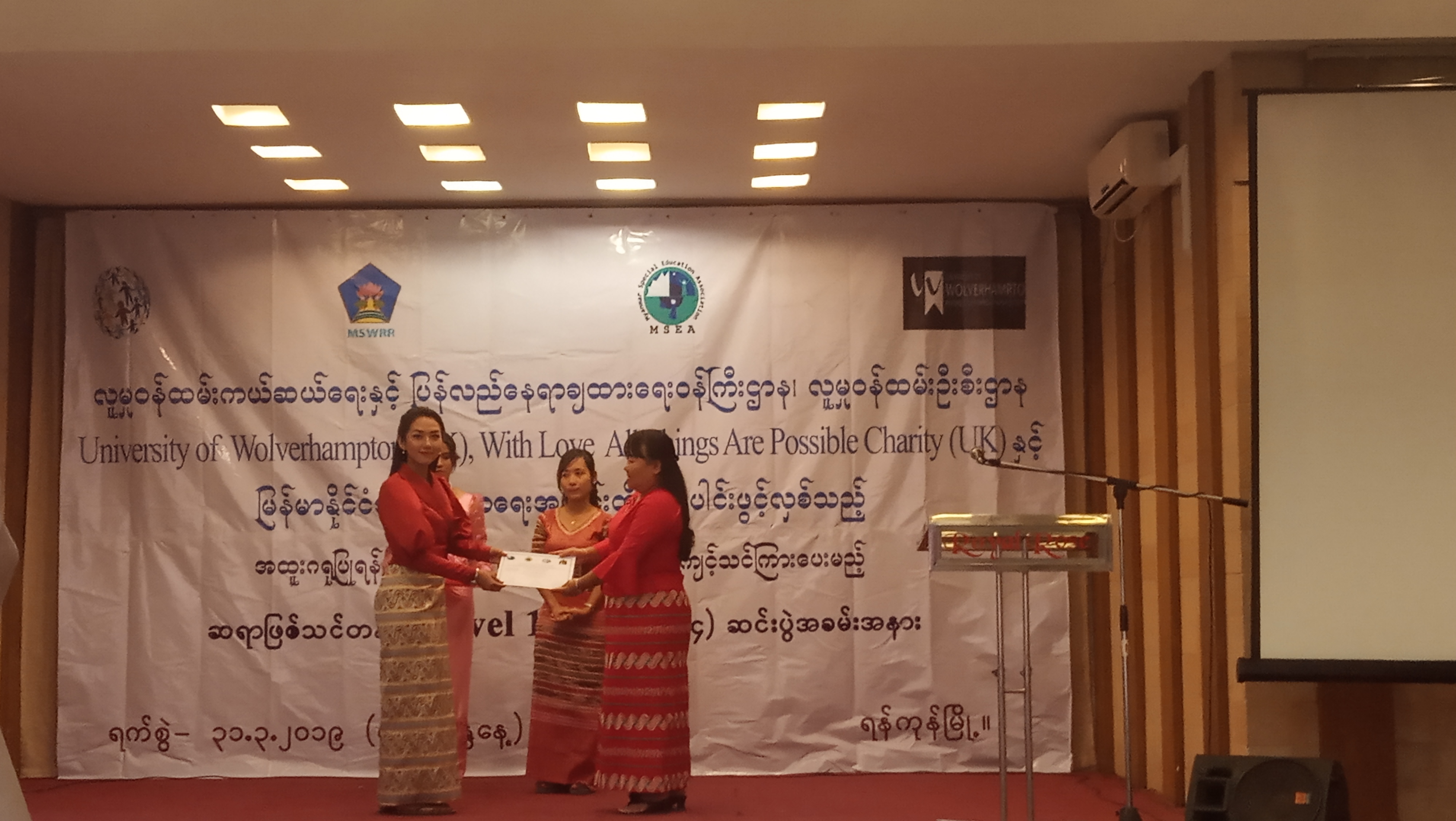 ယင်းနောက် မြန်မာနိုင်ငံအမျိုးသားလူ့အခွင့်အရေး ကော်မရှင် ဒုတိယဥက္ကဋ္ဌ ဦးစစ်မြိုင်နှင့် တာဝန်ရှိသူများက သင်တန်းဆင်းလက်မှတ်များပေးအပ်ပြီး အလှူငွေ ပေးအပ်သူတစ်ဦးထံ ဂုဏ်ပြုမှတ်တမ်းလွှာအား ပေးအပ်သည်။