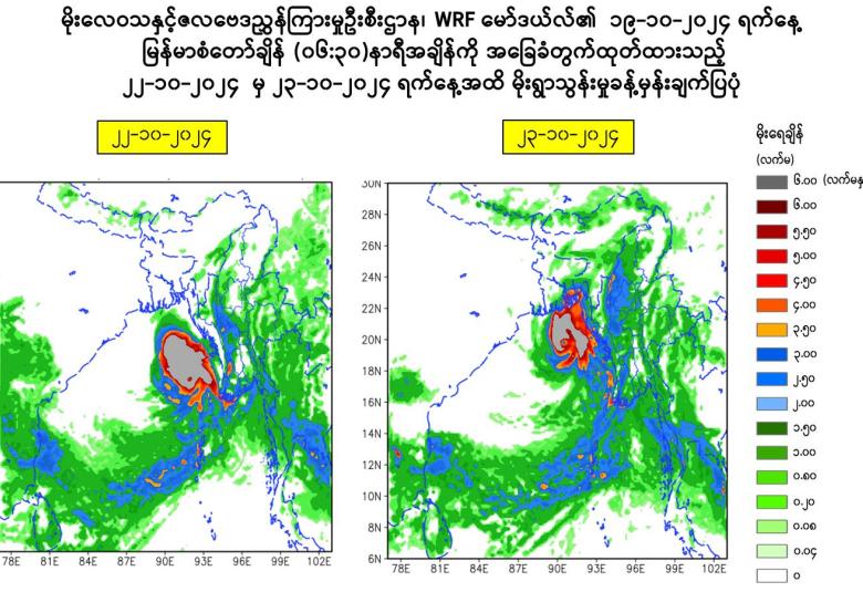 ယနေ့မြန်မာစံတော်ချိန် (၀၅:၃၀) နာရီ တိုင်းထွာချက်များအရ ကပ္ပလီပင်လယ်ပြင် မြောက်ပိုင်းတွင် ဖြစ်ပေါ်နေသော လေဖိအားနည်းဆဲလ်သည် ဆက်လက်တည်ရှိနေသည်။ အဆိုပါ လေဖိအားနည်းဆဲလ်သည် အနောက်မြောက်ဘက်သို့ ရွေ့လျားနိုင်ပြီး၊ ပိုမိုအားကောင်းလာနိုင်ကာ ဘင်္ဂလားပင်လယ်အော်အရှေ့အလယ်ပိုင်းနှင့် ယင်းနှင့်ဆက်စပ်လျက်ရှိသော ကပ္ပလီပင်လယ်ပြင် မြောက်ပိုင်းတို့တွင် ၂၁-၁၀-၂၀၂၄ ရက်နေ့၌ လေဖိအားနည်းရပ်ဝန်း(Low Pressure Area)အဖြစ်သို့ လည်းကောင်း၊ ၂၃-၁၀-၂၀၂၄ ရက်နေ့တွင် မုန်တိုင်းငယ်(Depression)အဖြစ်သို့လည်းကောင်း ရောက်ရှိ နိုင်သည်ဟု ခန့်မှန်းရသည်။