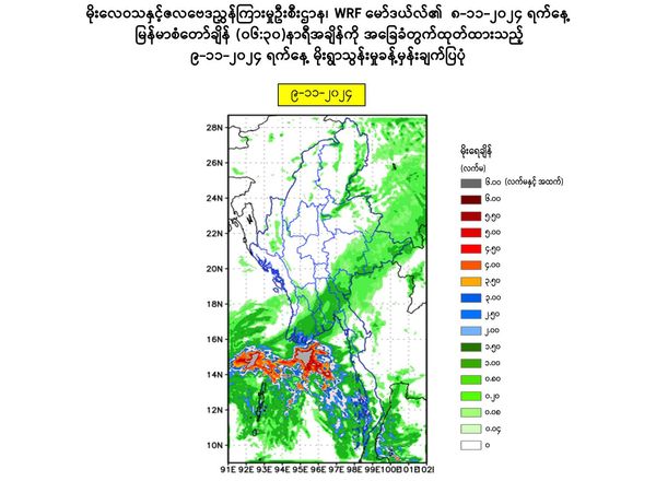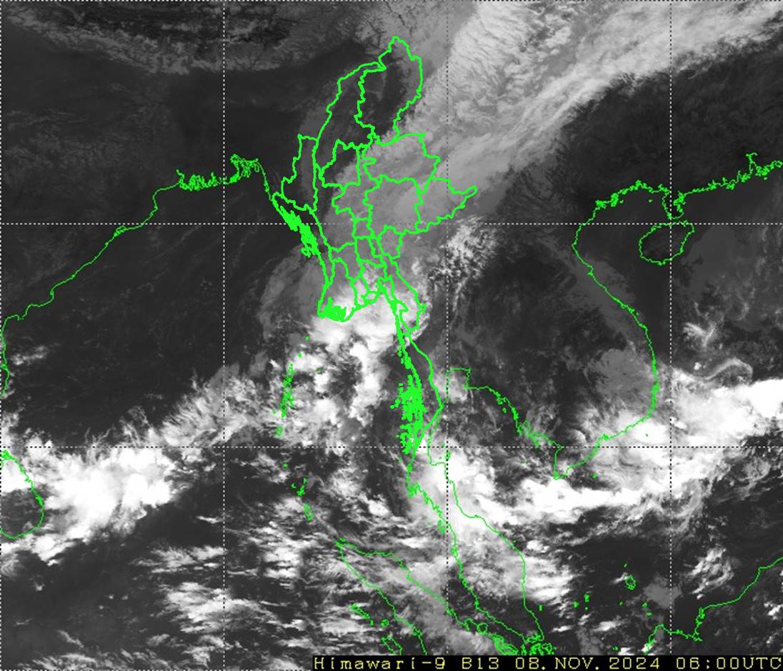 ၁။ ယနေ့မြန်မာစံတော်ချိန် (၁၂:၃၀)နာရီအချိန် တိုင်းထွာချက်များအရ တောင်တရုတ်ပင်လယ်ပြင်မှ ရွေ့လျားလာသော လေပွေလှိုင်းများကြောင့်လည်းကောင်း၊ ကပ္ပလီပင်လယ်ပြင်နှင့် ဘင်္ဂလားပင်လယ်အော်တို့မှ လေနွေးများနှင့် တရုတ်ပြည်မကြီးပေါ်ရှိ လေဖိအားကြီးရပ်ဝန်းဒေသမှ ရွေ့လျားလာသော လေအေးများတွေ့ဆုံမှုကြောင့်လည်းကောင်း၊ ကပ္ပလီပင်လယ်ပြင်နှင့် ဘင်္ဂလားပင်လယ်အော်အရှေ့ တောင်ပိုင်းတို့တွင် လေထုမငြိမ်မသက်မှုများ ဖြစ်ပေါ်လာနိုင်ခြင်း ကြောင့်လည်းကောင်း ယနေ့မွန်းလွဲမှ ၉-၁၁-၂၀၂၄ ရက်နေ့အတွင်း နေပြည်တော်၊ စစ်ကိုင်းတိုင်းဒေသကြီးအောက်ပိုင်း၊ မန္တလေးတိုင်းဒေသကြီး၊ မကွေးတိုင်းဒေသကြီး၊ တနင်္သာရီတိုင်းဒေသကြီး၊ ကချင်ပြည်နယ်နှင့် ရခိုင်ပြည်နယ်တို့တွင် နေရာကျဲကျဲနှင့် ပဲခူးတိုင်းဒေသကြီး၊ ရန်ကုန်တိုင်းဒေသကြီး၊ ဧရာဝတီတိုင်းဒေသကြီး၊ ရှမ်းပြည်နယ်၊ ကယားပြည်နယ်၊ ကရင်ပြည်နယ်နှင့် မွန်ပြည်နယ်တို့တွင် နေရာစိပ်စိပ်မှ နေရာအနှံ့အပြား မိုးထစ်ချုန်းရွာပြီး၊ အချို့ဒေသများတွင် ဒေသအလိုက် မိုးကြီးခြင်း၊ နေရာကွက်၍ မိုးကြီးခြင်းများ ဖြစ်ပေါ်နိုင်ပါသည်။
