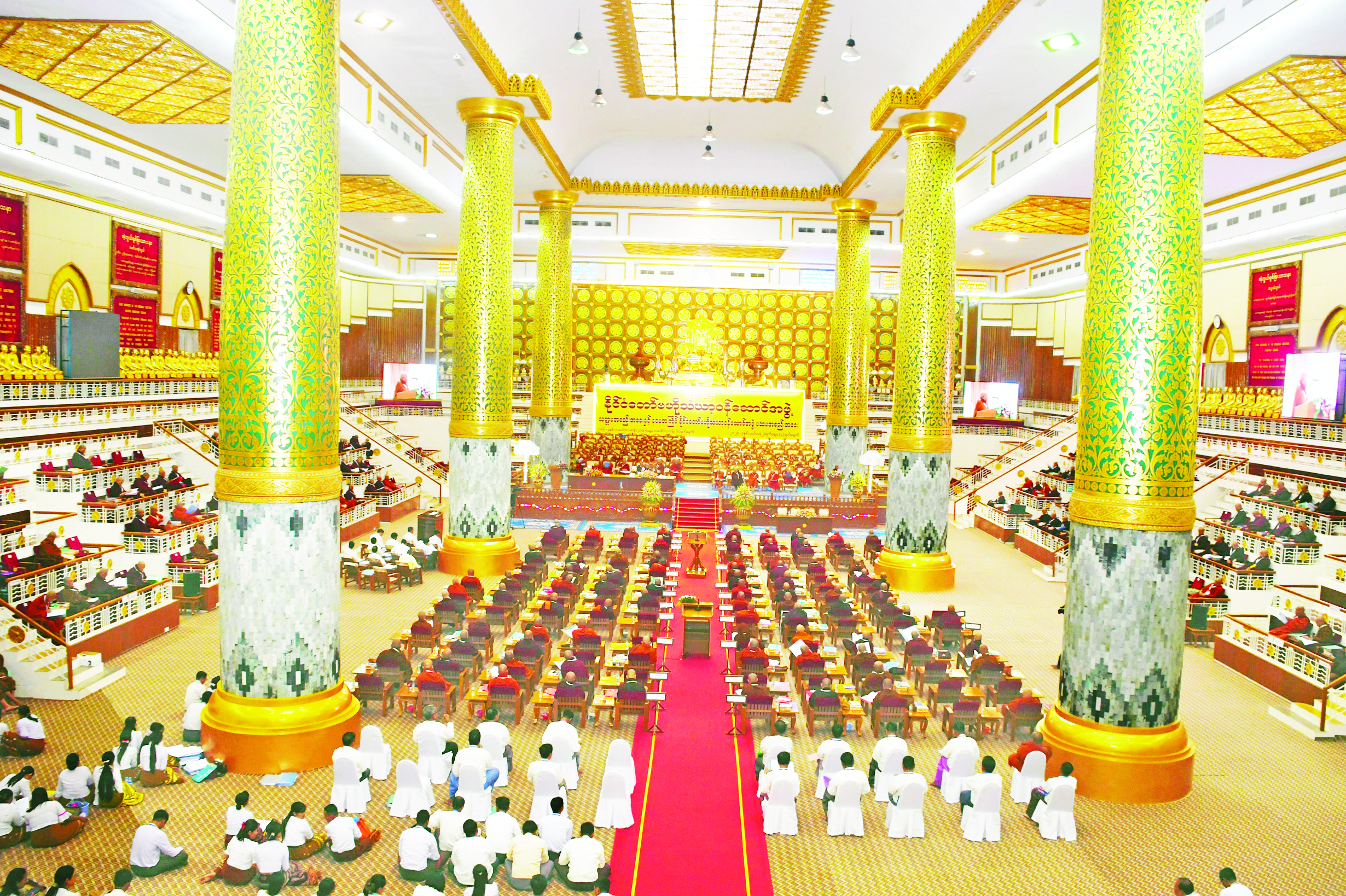 အစည်းအဝေး မစတင်မီ ပြည်ထောင်စုဝန်ကြီးက နိုင်ငံတော်ဩဝါဒါစရိယ ဆရာတော်ကြီးများ၊ နိုင်ငံတော် သံဃမဟာနာယက ဆရာတော်ကြီးများ၊ နိုင်ငံတော်ဗဟိုသံဃာ့ဝန်ဆောင် ဆရာတော်ကြီးများအား နဝကမ္မအလှူတော်ငွေများနှင့် မြတ်စွာဘုရားရှင် ဟောကြားတော်မူခဲ့သော ပရိတ်တော်၊ သုတ်တော်၊ ဒေသနာတော်များ ပါဠိမြန်မာပြန်စာအုပ်များကို ဆက်ကပ်လှူဒါန်းသည်။