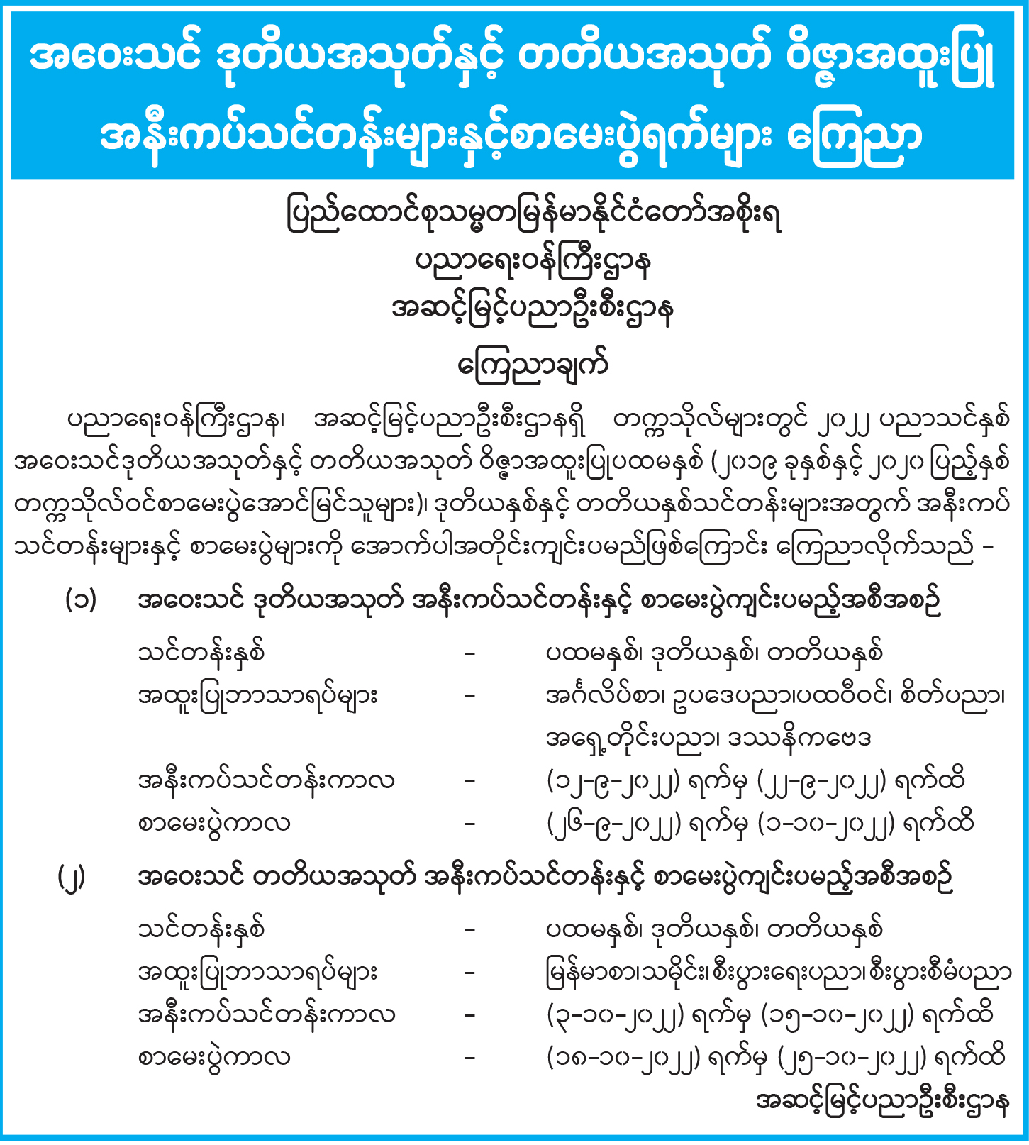 အဝေးသင် ဒုတိယအသုတ်နှင့် တတိယအသုတ် ဝိဇ္ဇာအထူးပြု အနီးကပ်သင်တန်းများနှင့်စာမေးပွဲရက်များ ကြေညာ