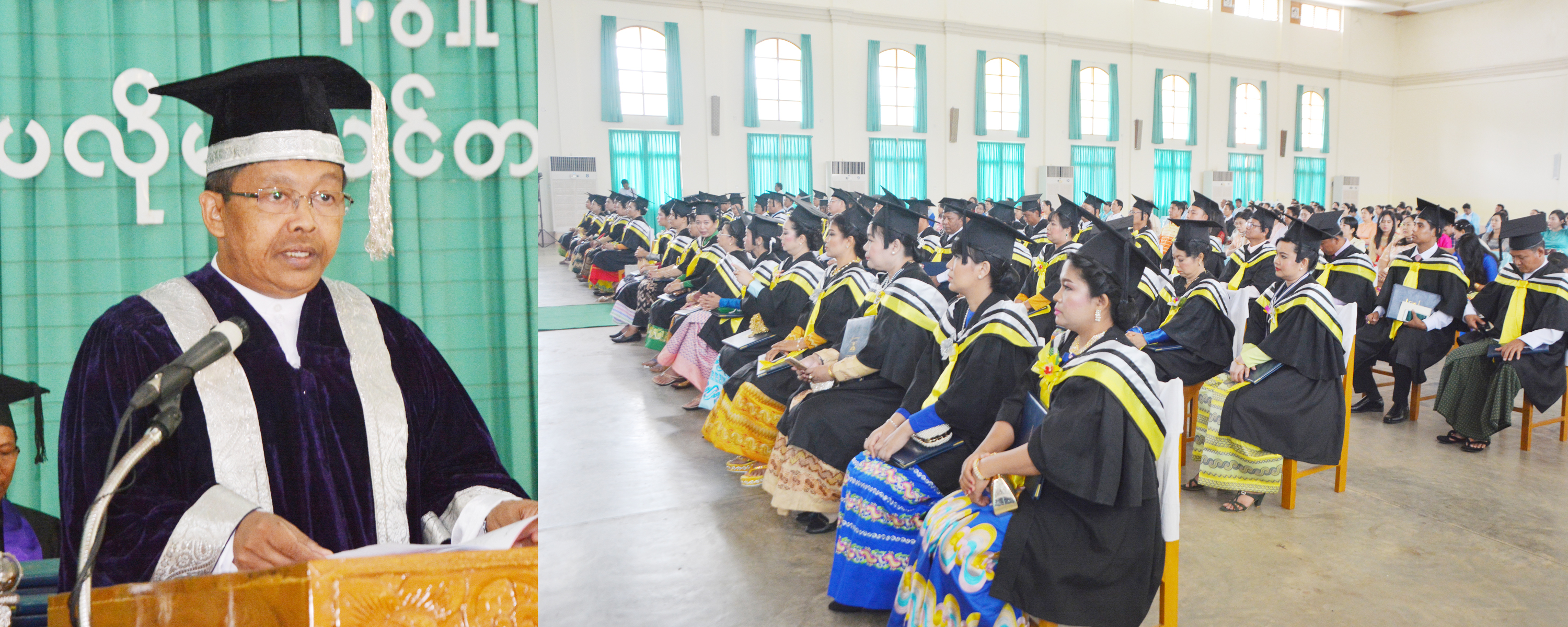 ဘွဲ့နှင်းသဘင်အခမ်းအနား၌ ဗဟိုဝန်ထမ်းတက္ကသိုလ် (အောက်မြန်မာပြည်) ပါမောက္ခချုပ် ဦးအောင်တင်စိုးက အမှာစကားပြောကြားသည်။