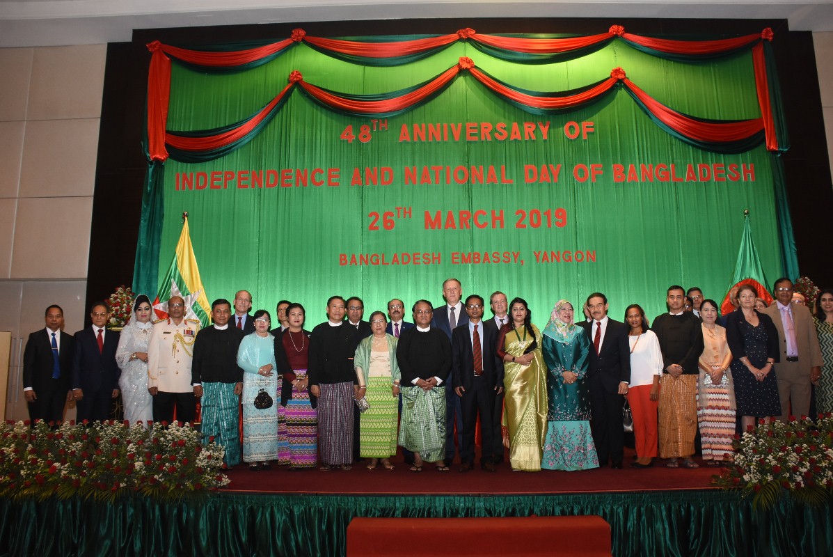 ဘင်္ဂလားဒေ့ရှ်နိုင်ငံ၏ (၄၈)နှစ်မြောက် လွတ်လပ်ရေးနေ့နှင့် အမျိုးသားနေ့ အထိမ်းအမှတ်ဧည့်ခံပွဲ အခမ်းအနားကို ယနေ့ ည ၇ နာရီတွင် ရန်ကုန်မြို့Sedona Hotel ၌ ကျင်းပရာ စီးပွားရေးနှင့် ကူးသန်းရောင်းဝယ်ရေးဝန်ကြီးဌာန ပြည်ထောင်စုဝန်ကြီး ဒေါက်တာသန်းမြင့်နှင့် ဇနီးဒေါ်ခင်ဌေးတို့ တက်ရောက်သည်။