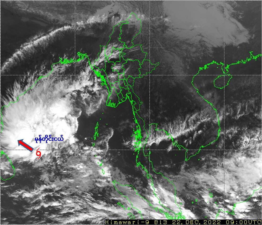 မိုးလေဝသနှင့်ဇလဗေဒညွှန်ကြားမှုဦးစီးဌာနက ယနေ့ ညနေထုတ်ပြန်သည့် မိုးလေဝသ သတင်းအရ ဘင်္ဂလားပင်လယ်အော် အနောက်တောင်ပိုင်းတွင် ဖြစ်ပေါ်နေသောမုန်တိုင်းငယ် (Depression) သည် မြန်မာနိုင်ငံ၊ ကိုကိုးကျွန်းမြို့ (Coco Island) ၏ အနောက်တောင်ဘက် ရေမိုင် (၅၈၀) မိုင်ခန့်၊ ဟိုင်းကြီးကျွန်းမြို့ (Hainggyikyun) ၏ အနောက်တောင်ဘက် ရေမိုင် (၆၉၀) မိုင်ခန့်၊ သီရိလင်္ကာနိုင်ငံ၊ ထရီကိုမာလီမြို့ (Trincomalee) ၏ အရှေ့ - အရှေ့မြောက်ဘက် ရေမိုင် (၂၂၅) မိုင်ခန့်၊ အိန္ဒိယနိုင်ငံ၊ နာဂါပတ္တနမ်မြို့ (Nagappattinam) ၏ အရှေ့-အရှေ့တောင်ဘက် ရေမိုင် (၃၅၀) မိုင်ခန့်နှင့် ချင်းနိုင်မြို့ (Chennai) ၏ အရှေ့တောင်ဘက် ရေမိုင် (၄၀၀) မိုင်ခန့်အကွာ ပင်လယ်ပြင်ကို ဗဟိုပြုနေသည်။ ကပ္ပလီပင်လယ်ပြင်မြောက်ပိုင်းတွင် တိမ်အနည်းငယ် ဖြစ်ထွန်းနေပြီး၊ ကပ္ပလီပင်လယ်ပြင် တောင်ပိုင်းနှင့် ဘင်္ဂလားပင်လယ်အော်တို့တွင် တိမ်အသင့်အတင့်မှ တိမ်ထူထပ်နေသည်။