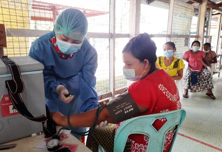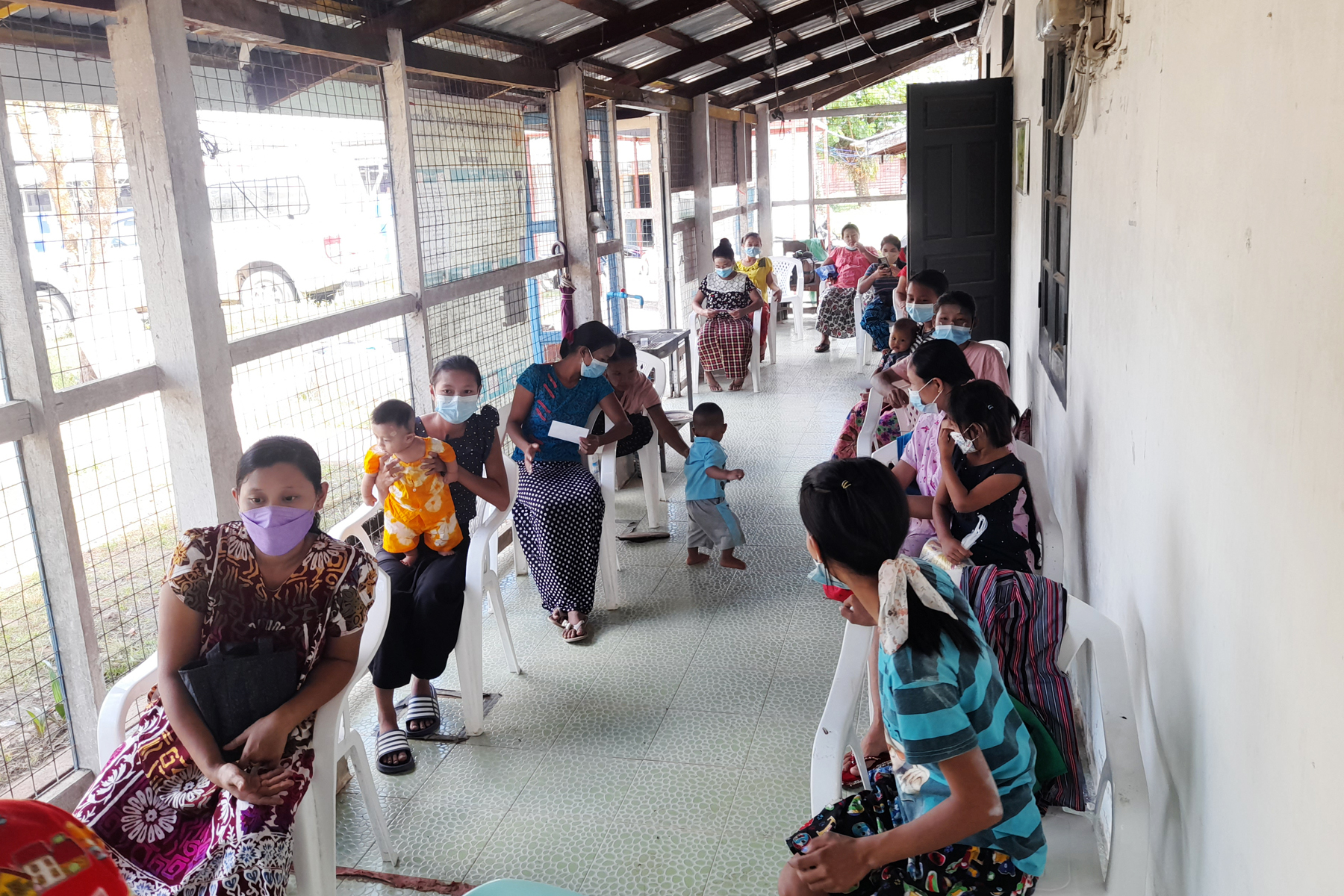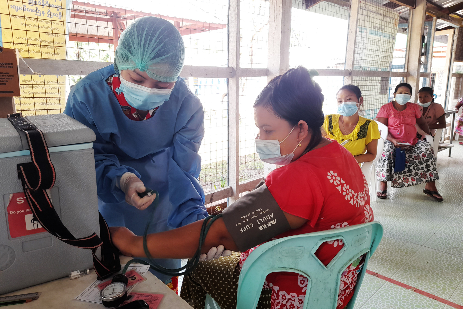 ကာကွယ်ဆေး လာရောက်ထိုးနှံကြသည့် ကိုယ်ဝန်ဆောင်အမျိုးသမီးများနှင့် နို့တိုက်မိခင်များကို ကျန်းမာရေးဝန်ထမ်းများက ကိုယ်အပူချိန် တိုင်းတာခြင်း၊ သွေးပေါင်ချိန် တိုင်းတာပေးခြင်း၊ သွေးတွင်းအောက်ဆီဂျင် တိုင်းတာခြင်းတို့ကို ဆောင်ရွက်ပေးလျက်ရှိပြီး ကိုဗစ်-၁၉ ရောဂါ ကာကွယ်ဆေးများ ထိုးနှံပေးလျက်ရှိကြောင်း သိရသည်။