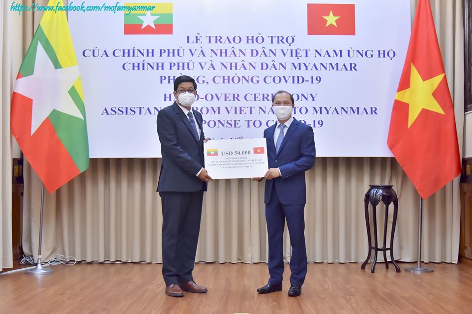 COVID-19 အသက်ရှူလမ်းကြောင်းဆိုင်ရာ ကူးစက်ရောဂါပြန့်ပွားမှု နှင့်ပတ်သက်၍ ကာကွယ် တုံ့ပြန်ရေးဆိုင်ရာ ပူးပေါင်းဆောင်ရွက်မှု တစ်ရပ်အနေဖြင့် ဗီယက်နမ်နိုင်ငံမှ မြန်မာနိုင်ငံသို့ အမေရိကန်ဒေါ်လာ ၅၀,ဝ၀ဝ (အမေရိကန်ဒေါ်လာ ငါးသောင်း) အား ပေးအပ်လှူဒါန်းသည့် အခမ်းအနားကို ၁၀-၄-၂၀၂၀ ရက်၊ နံနက် ၁၀:ဝ၀ နာရီအချိန်တွင် ဗီယက်နမ်ဆိုရှယ်လစ်သမ္မတနိုင်ငံ၊ ဟနွိုင်းမြို့ရှိ ဗီယက်နမ်နိုင်ငံခြားရေးဝန်ကြီးဌာန ရုံးအဆောက်အဦ၌ ကျင်းပပြုလုပ်ခဲ့ရာ ဗီယက်နမ် နိုင်ငံခြားရေးဝန်ကြီးဌာန၊ ဒုတိယဝန်ကြီး H.E. Mr. Nguyen Quoc Dung မှ အဆိုပါလှူဒါန်းငွေများကို လွှဲပြောင်းပေးအပ်ခဲ့ပြီး ဗီယက်နမ်နိုင်ငံဆိုင်ရာမြန်မာသံအမတ်ကြီးဦးကျော်စိုးဝင်းမှ လက်ခံရယူခဲ့ပါသည်။