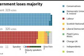 မနေ့က ပြန်လည်စတင်တဲ့ ဗြိတိန်လွှတ်တော်မှာ ဝန်ကြီးချုပ်ရဲ့ သဘောတူညီချက်မရှိဘဲ EUကထွက်ခွာမယ့် အစီအစဉ်ကို ကွန်ဆာဗေးတစ်ပါတီလွှတ်တော်အမတ် ၂၁ ဦးက အတိုက်ခံပါတီနဲ့ ပူးပေါင်းပြီး ဝန်ကြီးချုပ်ကို ဆန့်ကျင်ခဲ့ပါတယ်။ EUကနေ သဘောတူညီချက်မရှိဘဲ မထွက်ခွာရေး မဲခွဲရာ ထောက်ခံမဲ ၃၂၈ မဲ၊ ကန့်ကွက်မဲ ၃၀၁ မဲနဲ့ ထောက်ခံမဲဘက်က အနိုင်ရရှိသွားပါတယ်။