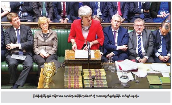 ဗြိတိန်ဝန်ကြီးချုပ် ထရီဆာမေ နောက်ဆုံးတင်သွင်းခဲ့သည့် ဥရောပသမဂ္ဂမှ ဗြိတိန်နုတ်ထွက်ရေးဆိုင်ရာ သဘောတူညီချက်မူကြမ်းကို ယမန်နေ့က ဗြိတိန်လွှတ်တော်၌ အမတ်များက ပယ်ချခဲ့သည်။ ၎င်း၏အဆိုကို လက်မခံသည့်အတွက် စိတ်မကောင်းဖြစ်မိကြောင်း ဝန်ကြီးချုပ်မေက ပြောသည်။
