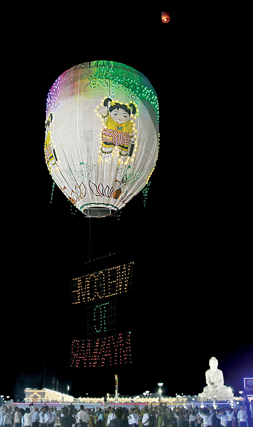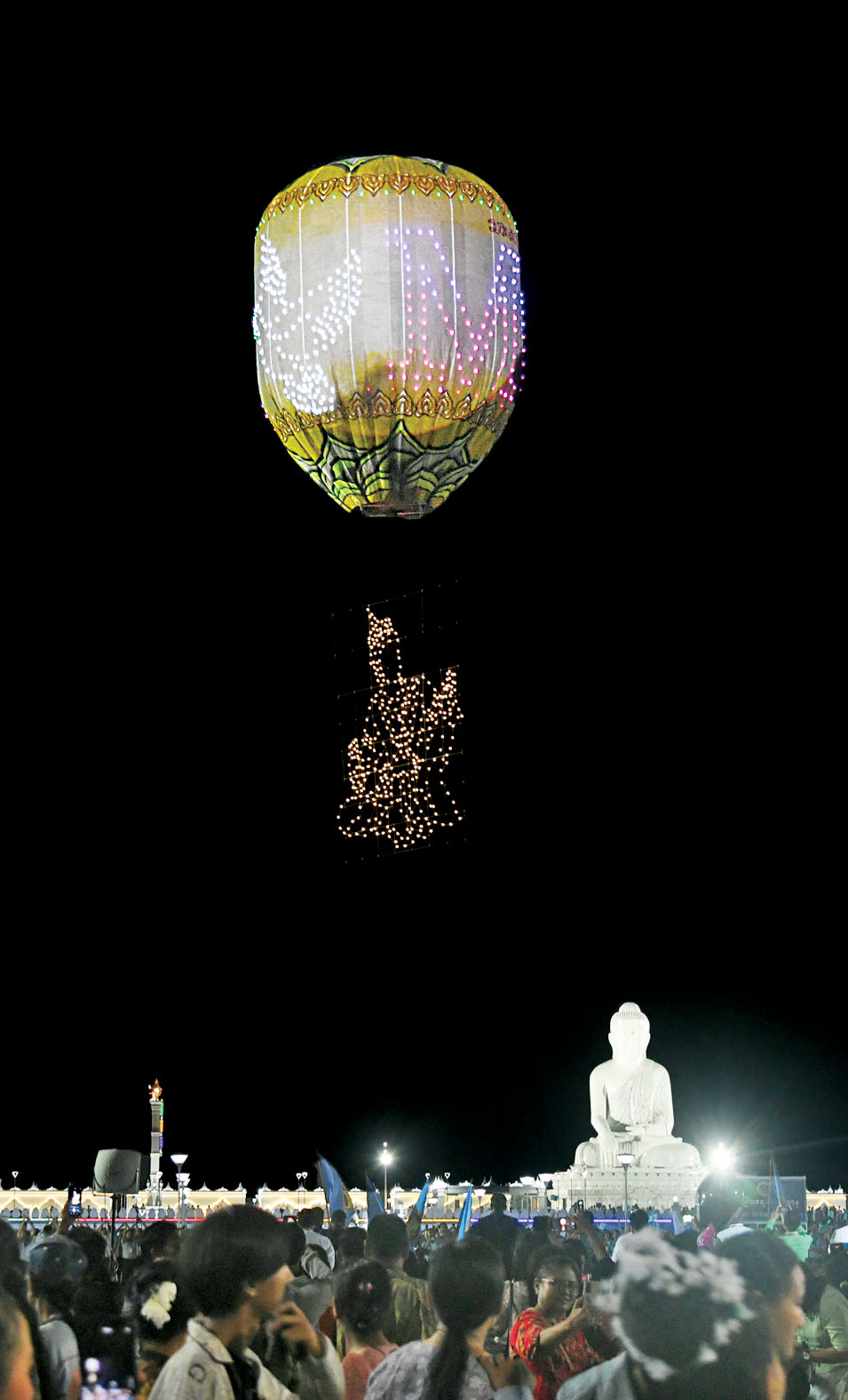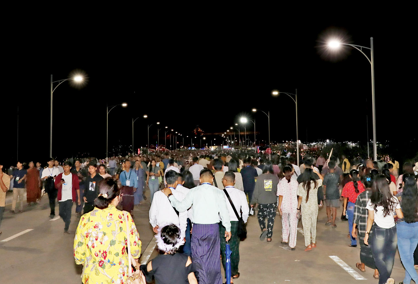 ယင်းနောက် နိုင်ငံတော်ယာယီသမ္မတ နိုင်ငံတော်လုံခြုံရေးနှင့်အေးချမ်းသာယာ ရေးကော်မရှင်ဥက္ကဋ္ဌနှင့်ဇနီး၊ အခမ်းအနား တက်ရောက်လာကြသူများသည် ညမီးကြီး မီးပုံးပျံများနှင့် စိန်နားပန်မီးပုံးပျံများ လွှတ်တင်မှုများကို မာရဝိဇယဗုဒ္ဓရုပ်ပွားတော်မြတ် ကြီး တန်ဆောင်တိုင်မီးထွန်းပွဲတော်သို့ လာရောက်ကြသည့် ဘုရားဖူးလာရဟန်းရှင်လူ ပြည်သူများနှင့်အတူ ကြည့်ရှုအားပေးကြသည်။
