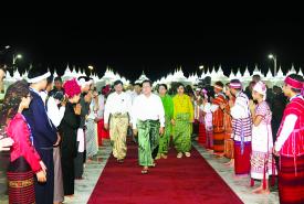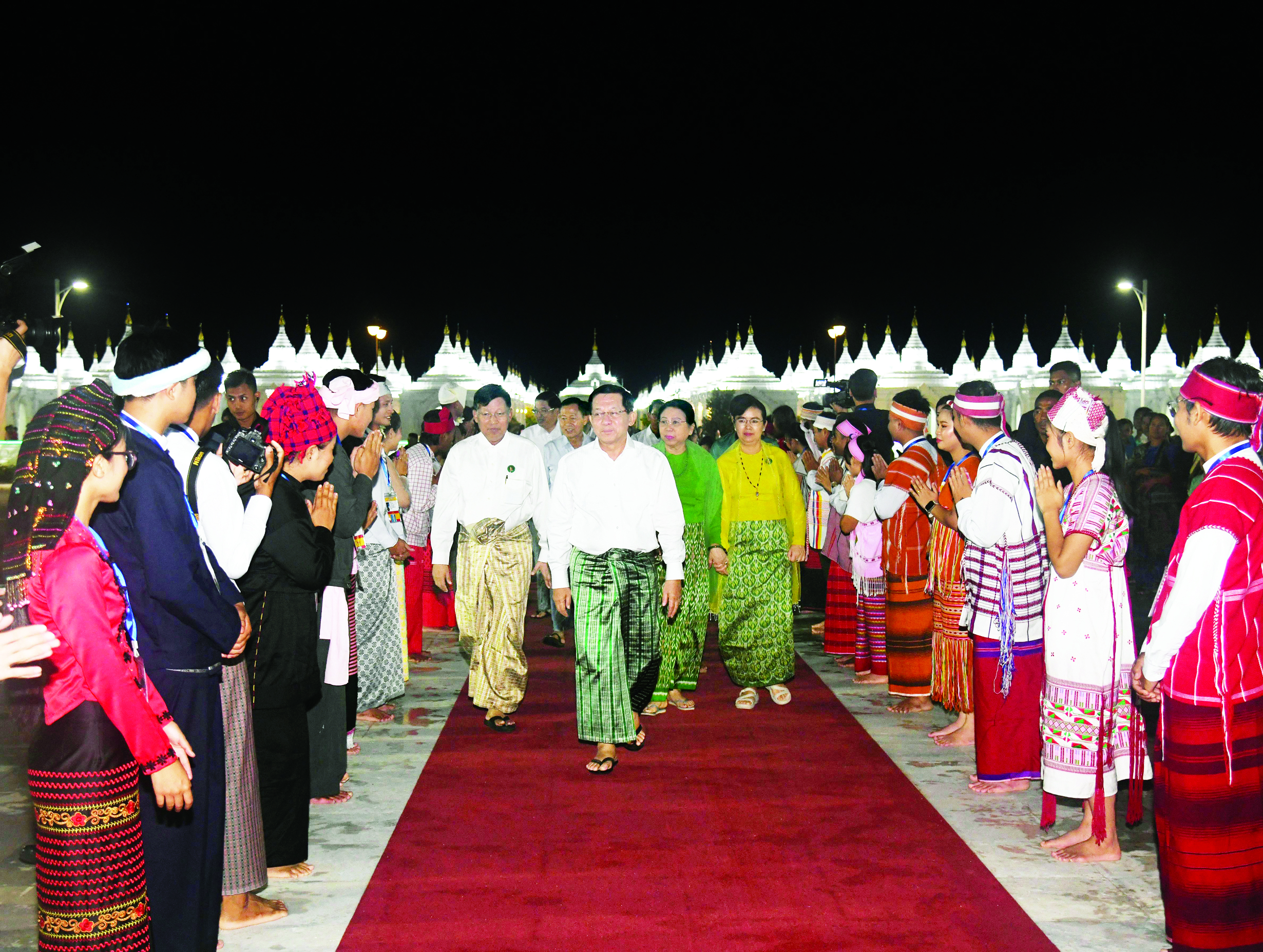 ဦးစွာ နိုင်ငံတော်ယာယီသမ္မတ နိုင်ငံတော်လုံခြုံရေးနှင့် အေးချမ်း သာယာရေးကော်မရှင် ဥက္ကဋ္ဌနှင့် ဇနီးတို့သည် အခမ်းအနား ကျင်းပမည့်နေရာသို့ ရောက်ရှိကြရာ တာဝန်ရှိသူများ၊ မြန်မာ့အသံနှင့်ရုပ်မြင်သံကြားမှ တိုင်းရင်းသား၊ တိုင်းရင်းသူများ၊ သာသနာရေးနှင့် ယဉ်ကျေးမှုဝန်ကြီးဌာနအနုပညာဦးစီးဌာနမှ ယဉ်ကျေးမှုအဖွဲ့များ လှိုက်လှဲ နွေးထွေးစွာ ကြိုဆိုကြသည်။