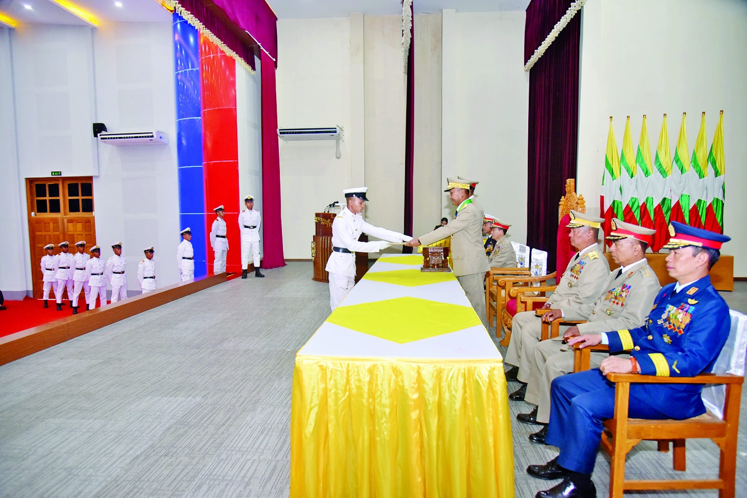 တပ်မတော်နည်းပညာတက္ကသိုလ် ဗိုလ်လောင်းသင်တန်းအမှတ်စဉ် (၂၇) ပြန်တမ်းဝင်အရာရှိ ခန့်အပ်ခြင်း အခမ်းအနားကို ယနေ့နံနက်ပိုင်းတွင် တပ်မတော်နည်းပညာတက္ကသိုလ် ဘွဲ့နှင်းသဘင် ခန်းမ၌ကျင်းပရာ ကာကွယ်ရေးဦးစီးချုပ်ရုံး (ကြည်း)၊ စစ်ရာထူးခန့်ချုပ် ဒုတိယဗိုလ်ချုပ်ကြီး ထိန်ဝင်း၊ ကာကွယ်ရေး ဦးစီးချုပ်ရုံးမှ တပ်မတော်အရာရှိကြီးများ၊ တပ်မတော်နည်းပညာ တက္ကသိုလ်ကျောင်းအုပ်ကြီးနှင့် ကျောင်းဆင်းဗိုလ်လောင်းများ တက်ရောက်ကြသည်။