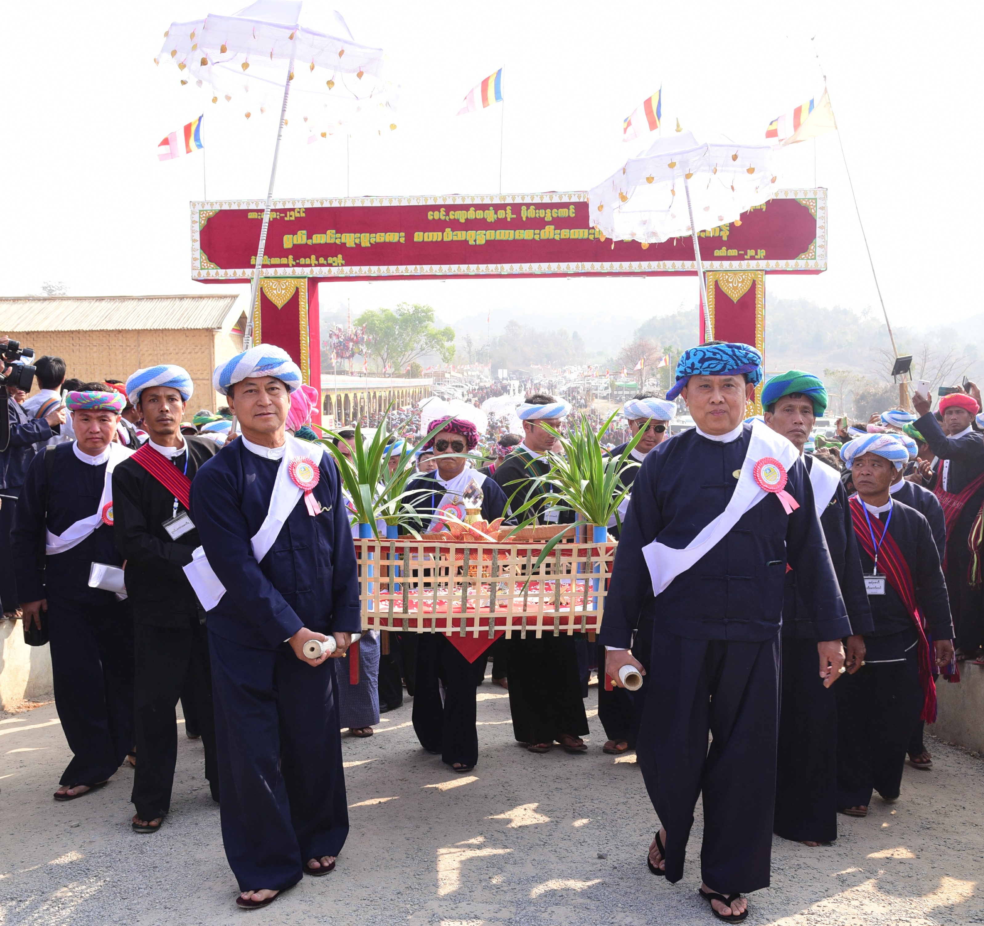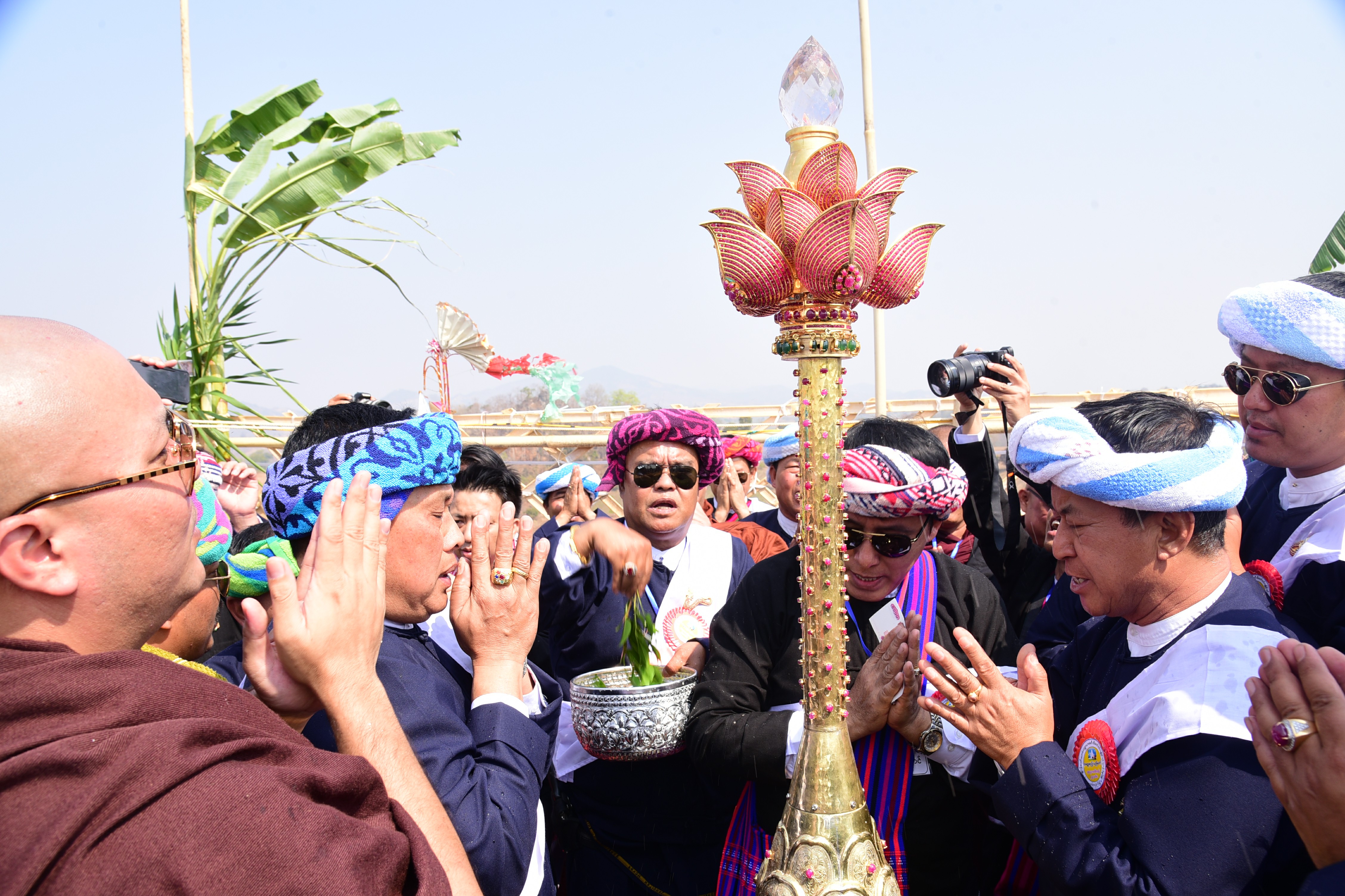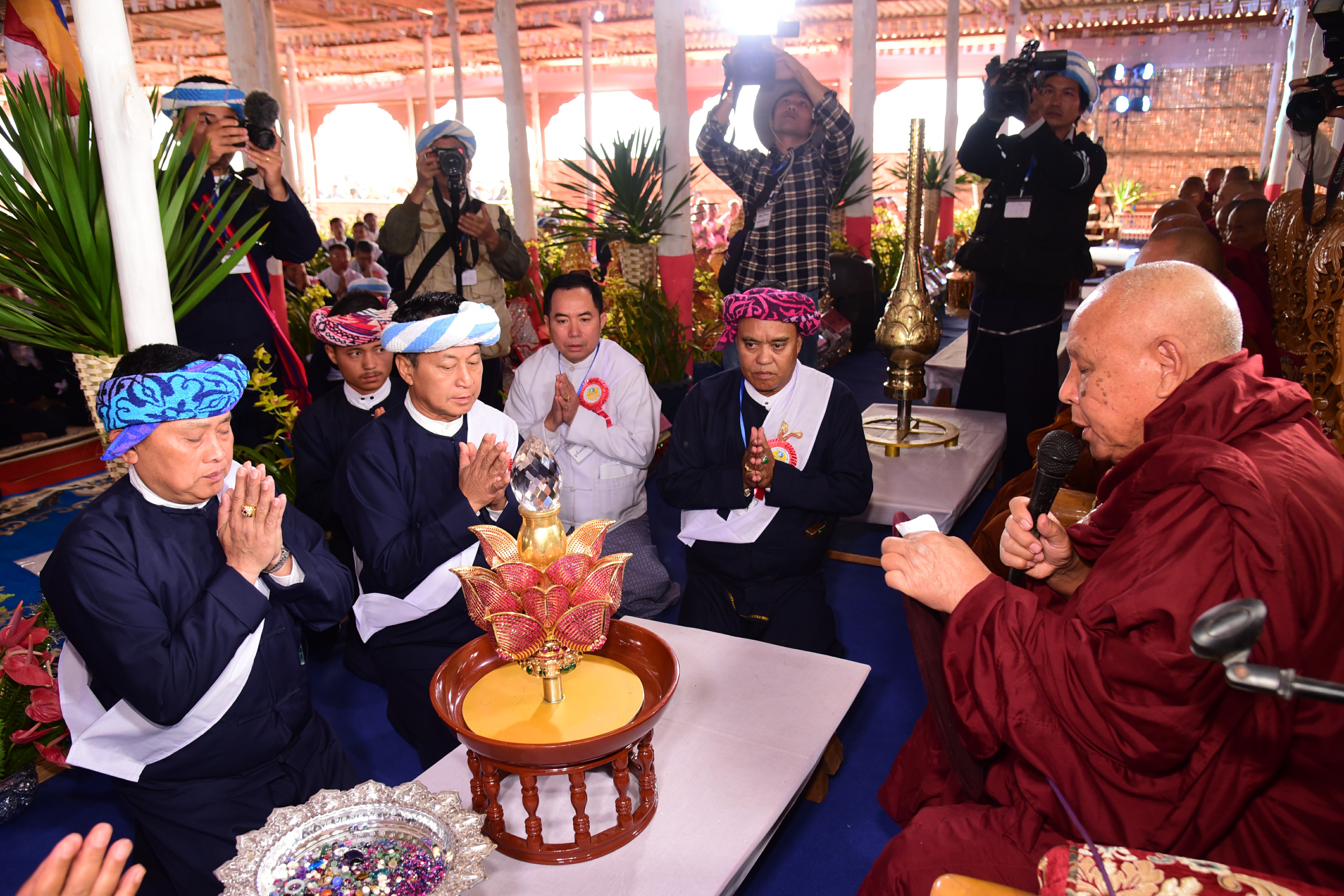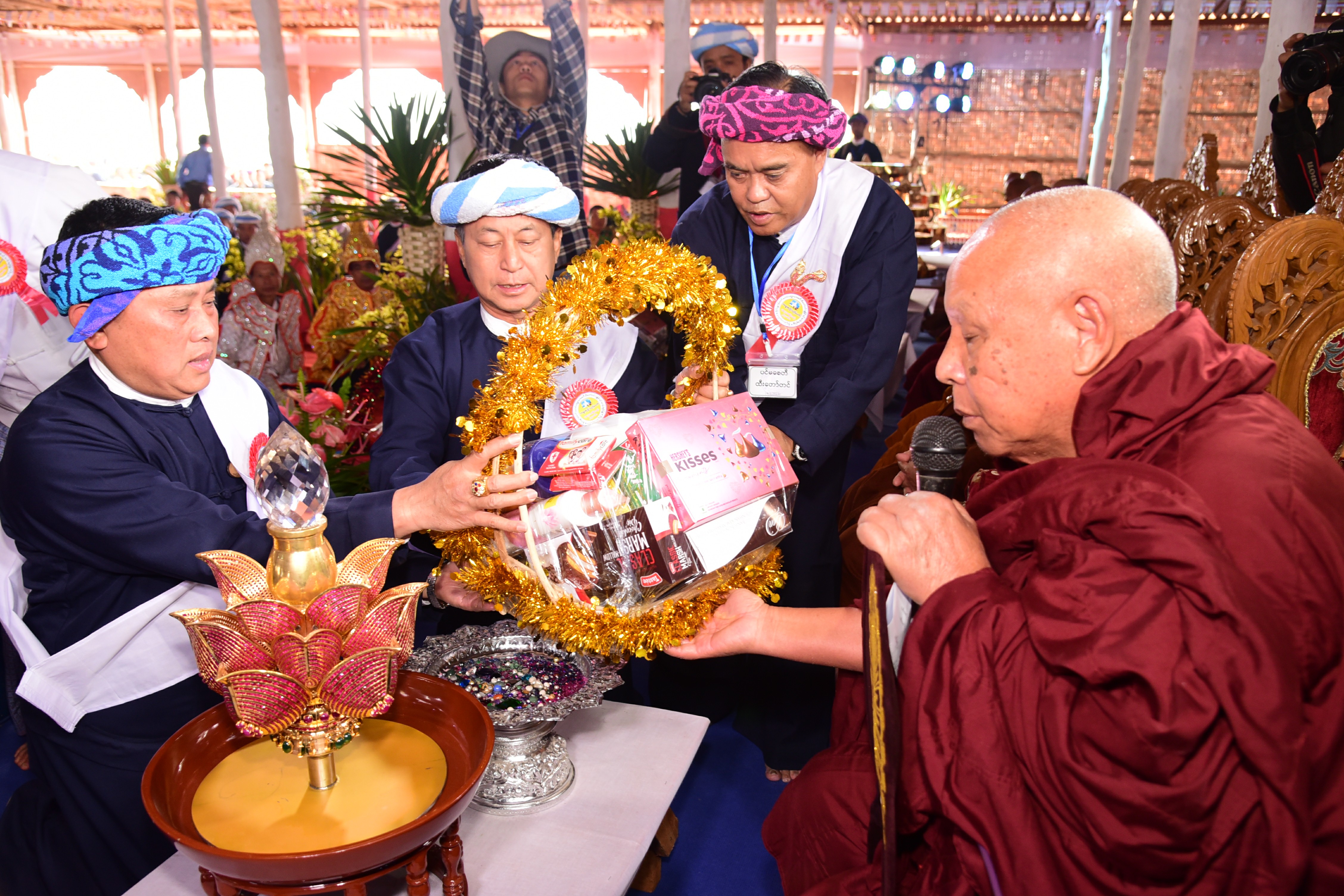 အခမ်းအနားတွင် ဆရာတော်၊ သံဃာတော်နှင့် နိုင်ငံတော် စီမံအုပ်ချုပ်ရေးကောင်စီအဖွဲ့ဝင် ဦးခွန်စံလွင်၊ ရှမ်းပြည်နယ်ဝန်ကြီးချုပ် ဦးအောင်ဇော်အေး အမှူးပြုသော ဧည့်ပရိသတ်တို့က နမောတဿ သုံးကြိမ်ရွတ်ဆို ဘုရားကန်တော့ဖွင့်လှစ်ပြီး ပအိုဝ်းအမျိုးသားခေါင်းဆောင် အဂ္ဂမဟာသီရိသုဓမ္မ မဏိဇောတဓရ ဝဏ္ဏကျော်ထင် ဦးအောင်ခမ်းထီက သမ္မာဒေဝနတ်ဗြဟ္မာအား ပင့်ဖိတ်ပေးသည်။ ဆက်လက်၍ တောင်ကြီးမြို့၊ မူလမင်းကွန်း ကျောင်းတိုက် ဦးစီပဓာန နာယက နိုင်ငံတော်သြဝါဒါစရိယ၊ အဂ္ဂမဟာပဏ္ဍိတ ဘဒ္ဒန္တပညာသီရိထံမှ ပရိသတ်များက ကိုးပါးသီလ ခံယူဆောက်တည်ကြပြီး ဆရာတော်၊ သံဃာတော်များက ပရိတ်တရားတော်များ ရွတ်ပွားချီးမြှင့်သည်။