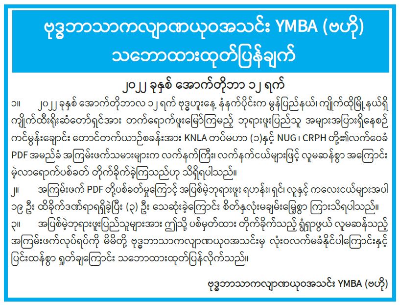 ၂။        အကြမ်းဖက် PDF တို့ပစ်ခတ်မှုကြောင့် အပြစ်မဲ့ဘုရားဖူး ရဟန်း၊ ရှင်၊ လူနှင့် ကလေးငယ် များအပါ ၁၉ ဦး ထိခိုက်ဒဏ်ရာရရှိခဲ့ပြီး (၃) ဦး သေဆုံးခဲ့ကြောင်း စိတ်နှလုံးမချမ်းမြေ့စွာ ကြားသိရပါသည်။