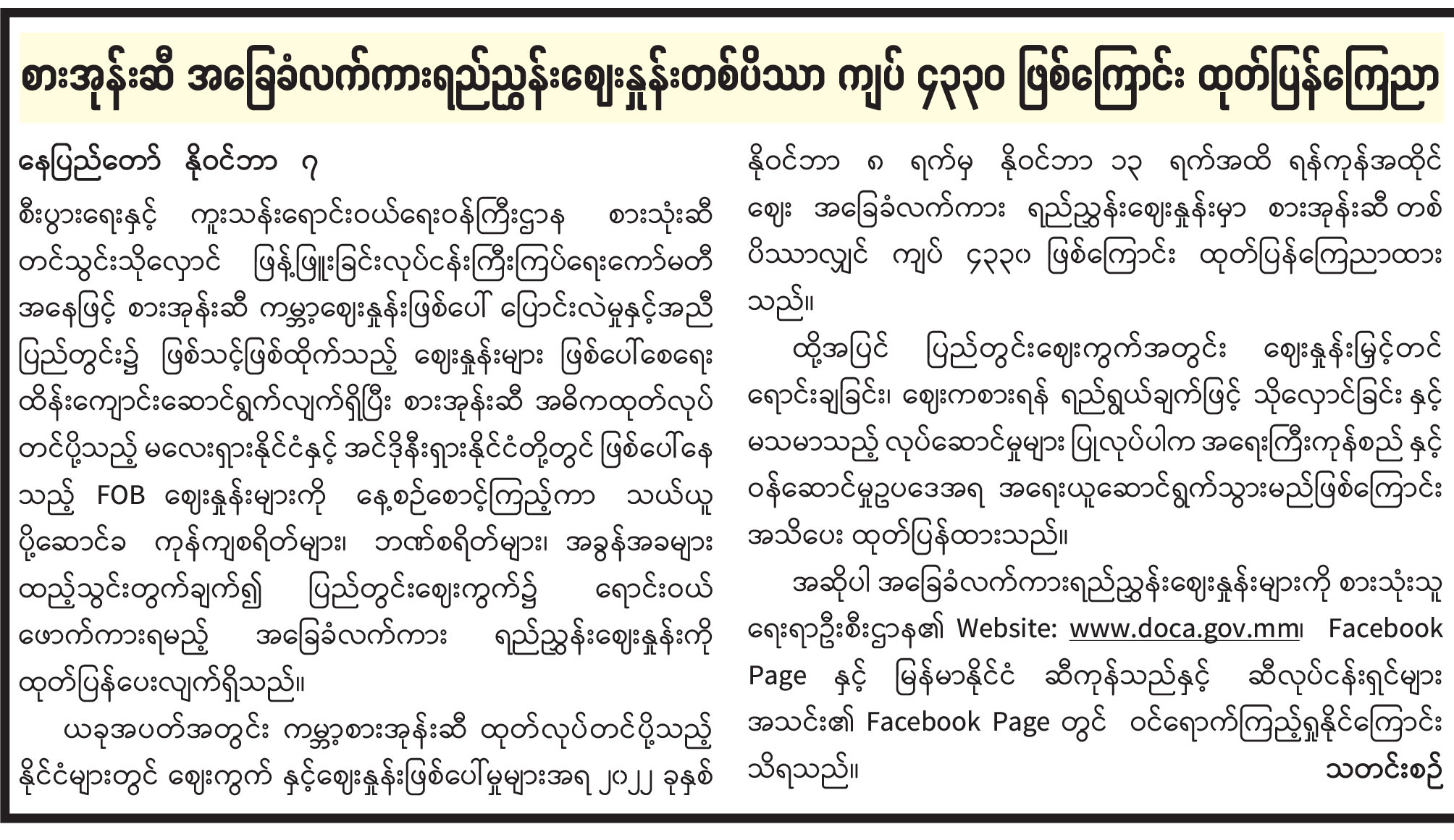 စားအုန်းဆီ အခြေခံလက်ကားရည်ညွှန်းဈေးနှုန်းတစ်ပိဿာ ကျပ် ၄၃၃၀ ဖြစ်ကြောင်း ထုတ်ပြန်ကြေညာ