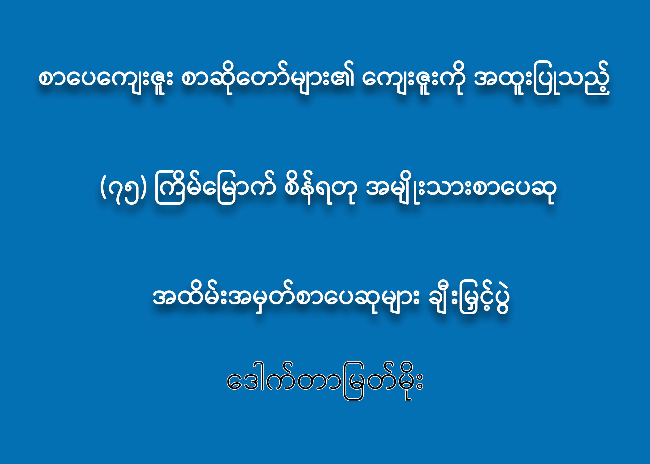 ယခုနှစ် ဒီဇင်ဘာလ ၁ ရက်နေ့သည်ကား ကြုံကြိုက်ခဲသော (၇၅) ကြိမ်မြောက် စိန်ရတုအမျိုးသား စာပေဆုချီးမြှင့်ပွဲ အထိမ်းအမှတ်နှစ်ဖြစ်သည် နှင့်အညီ ၂၀၂၃ ခုနှစ်အတွက် အမျိုးသားစာပေ တစ်သက်တာဆု၊ အမျိုးသားစာပေဆု၊ စာပေဗိမာန် စာမူဆု ချီးမြှင့်ပွဲနှင့် စာဆိုတော်နေ့အခမ်းအနားများကို မင်္ဂလာတရားနှင့်အညီ စည်ကားခမ်းနားစွာ ကျင်းပသွားမည် ဖြစ်ပါသည်။ စာပေအမွေ လက်ဆင့်ကမ်းသည့် မွန်မြတ်လှပသော အစဉ်အလာကောင်းကို ဆက်လက်ထိန်းသိမ်းခြင်းလည်း ဖြစ်ပါသည်။