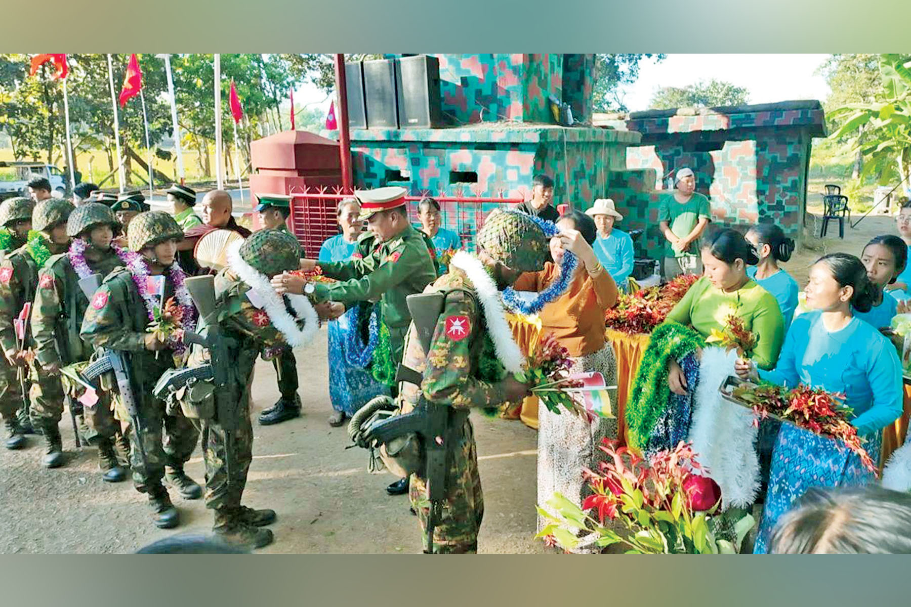 ပြည်သူများအား နှိပ်စက်ညှဉ်းပန်း၍ ဒေသဖွံ့ဖြိုးတိုးတက်မှုကို ချွတ်ခြုံကျစေသည့် အကြမ်းဖက်လုပ်ရပ်များကို လုပ်ဆောင်ခဲ့သော ကျောက်မဲမြို့ဒေသတစ်ဝိုက်ရှိ လက်နက်ကိုင်အကြမ်းဖက်အဖွဲ့များနှင့် PDF အမည်ခံ အကြမ်းဖက်အဖွဲ့များအား ရွပ်ရွပ်ချွံချွံ တိုက်ပွဲဝင်၍ အဆိုပါမြို့နှင့်ဒေသ တစ်ဝိုက်အား ဒေသခံပြည်သူများ၏ လက်ဝယ်သို့ ပြန်လည်အပ်နှင်း နိုင်ခဲ့သည့် အောင်ပွဲအလီလီရ ရှေ့တန်းပြန် နိုင်ငံ့သားကောင်း တပ်မတော်သားများအား ဂုဏ်ပြုကြိုဆိုခြင်းကို ယနေ့နံနက်ပိုင်းတွင် ရှမ်းပြည်နယ်(မြောက်ပိုင်း) သီပေါမြို့နယ် နမ့်လန်ကျေးရွာအုပ်စုရှိ နယ်မြေခံတပ်ရင်း၌ ကျင်းပပြုလုပ်ရာ အရှေ့မြောက် တိုင်းစစ်ဌာနချုပ် တိုင်းမှူး ဗိုလ်မှူးချုပ် အေးမင်းဦးနှင့် တာဝန်ရှိသူများ၊ ဌာနဆိုင်ရာ တာဝန်ရှိသူများ၊ တပ်မတော်သားများ၊ မိသားစုဝင်များ၊ ဆရာ ဆရာမများ၊ ကျောင်းသား ကျောင်းသူများနှင့် ဒေသခံတိုင်းရင်းသား ပြည်သူများက ဝမ်းမြောက်စွာ သောင်းသောင်းဖြဖြ ကြိုဆိုဂုဏ်ပြုကြသည်။