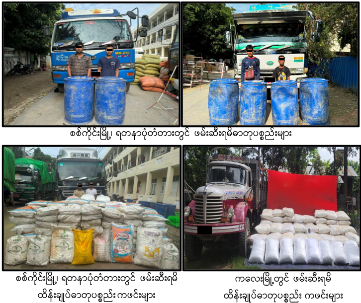 စစ်ဆေးဖော်ထုတ်ချက်အရ သိမ်းဆည်းရမိ ထိန်းချုပ်ဓာတု ပစ္စည်းများနှင့် အခြားဓာတု ပစ္စည်းများအား မြန်မာ-အိန္ဒိယနယ်စပ်မှ ကလေးမြို့သို့ သယ်ဆောင်ပြီး မန္တလေးတိုင်းဒေသကြီးမှတစ်ဆင့် မူးယစ်ဆေးဝါး ထုတ်လုပ်ရာတွင် အသုံးပြုရန် ရှမ်းပြည်နယ်သို့ တရားမဝင် သယ်ဆောင်ရောင်းဝယ်ခြင်းဖြစ်ကြောင်း သိရှိရသဖြင့် ၎င်းတို့အား ဥပဒေအရအရေးယူ ထားရှိပြီး ကွင်းဆက်ပြစ်မှု ကျူးလွန်သူများအား ဆက်လက်စစ်ဆေး ဖော်ထုတ်လျက်ရှိကြောင်း  သိရသည်။