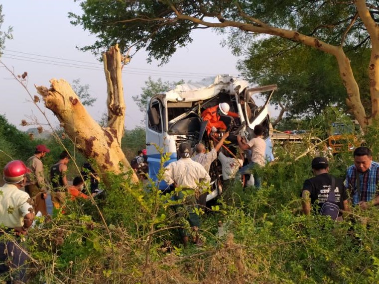 စစ်ကိုင်းမြို့နယ် အုန်းတောနယ်မြေ မီးသတ်စခန်း၏ မြောက်ဘက်(၆)မိုင်ခန့်အကွာ ရွှေဘို-မန္တလေး ကားလမ်း မိုင်တိုင်အမှတ်(၃၃/၄)အနီး ဆီသည်ဘောက်ဆာယာဉ်သည် မေ ၁၆ ရက်၊ နံနက် ၅  နာရီ ၄၅ မိနစ်အချိန်က အရှိန်မထိန်းနိုင်ဘဲ တစ်ဖက်ယာဉ်ကြော လမ်းဘေးရှိ ထနောင်းပင်သို့ဝင်ရောက် တိုက်မှုဖြစ်ပွားခဲ့ကြောင်း သိရသည်။
