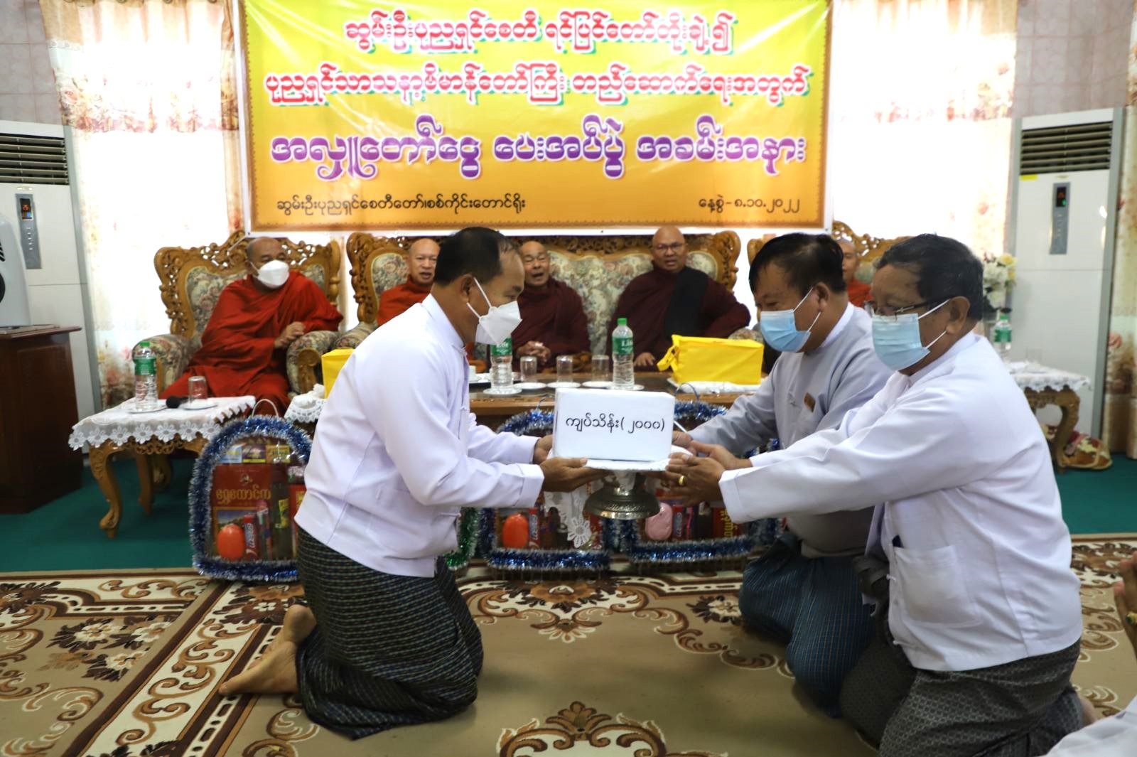 ရှေးဦးစွာ နမောတဿ သုံးကြိမ်ရွတ်ဆို၍ အခမ်းအနားကို ဖွင့်လှစ်ပြီး စစ်ကိုင်းမြို့၊ သောတပန်ရပ်ကွက်၊ ခေမာသီဝံကျောင်းတိုက်၊ နိုင်ငံတော်သြဝါဒါစရိယ မဟာသဒ္ဒမ္မဇောတိကဓဇ ဘဒ္ဒန္တပညာသီရီထံမှ တိုင်းဒေသကြီး ဝန်ကြီးချုပ်နှင့် ဧည့်ပရိသတ်များက ငါးပါးသီလ ခံယူဆောက်တည်ကြသည်။ ယင်းနောက် တိုင်းဒေသကြီး ဝန်ကြီးချုပ်နှင့် သယံဇာတရေးရာ ဝန်ကြီးတို့က ဆွမ်းဦးပုညရှင် ဂေါပကအဖွဲ့ထံ တိုင်းဒေသကြီး အစိုးရအဖွဲ့မှ လှူဒါန်းသည့် ငွေကျပ် သိန်း ၅၀၀ ကိုလည်းကောင်း၊ အလှူရှင်များက တိုင်းဒေသကြီး ဝန်ကြီးချုပ်၊ တာဝန်ရှိသူများနှင့် တည်ဆောက်ရေးကော်မတီထံ အလှူငွေများကို လည်းကောင်း အသီးသီးပေးအပ်လှူဒါန်းကြသည်။
