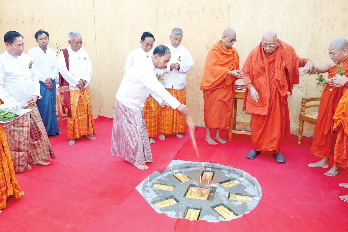 ထို့နောက် တိုင်းဒေသကြီးဝန်ကြီးချုပ်နှင့် တာဝန်ရှိသူများက ရတနာကြုတ်များအား အုပ်မြစ်တော် အလယ်ဗဟိုရှိ သတ်မှတ်နေရာများတွင် အုတ်မြစ်စီ မင်္ဂလာပြုလုပ်ကြပြီး သီတဂူဆရာတော်ကြီးနှင့်အတူ အမွှေးနံ့သာများ ပက်ဖျန်းကာ ရတနာရွှေမိုး၊ ငွေမိုး ရွာသွန်းဖြိုးကြသည်။