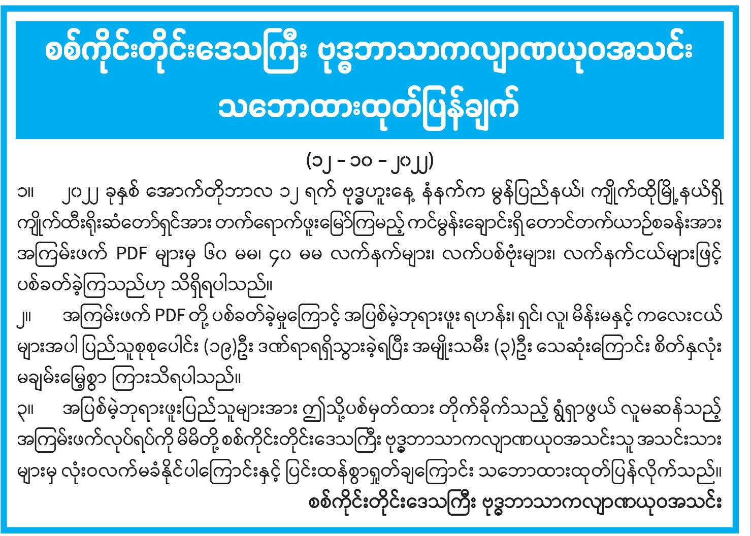 ၃။ အပြစ်မဲ့ဘုရားဖူးပြည်သူများအား ဤသို့ပစ်မှတ်ထား တိုက်ခိုက်သည့် ရွံရှာဖွယ် လူမဆန်သည့် အကြမ်းဖက်လုပ်ရပ်ကို မိမိတို့ စစ်ကိုင်းတိုင်းဒေသကြီး ဗုဒ္ဓဘာသာကလျာဏယုဝအသင်းသူ အသင်းသား များမှ လုံးဝလက်မခံနိုင်ပါကြောင်းနှင့် ပြင်းထန်စွာရှုတ်ချကြောင်း သဘောထားထုတ်ပြန်လိုက်သည်။