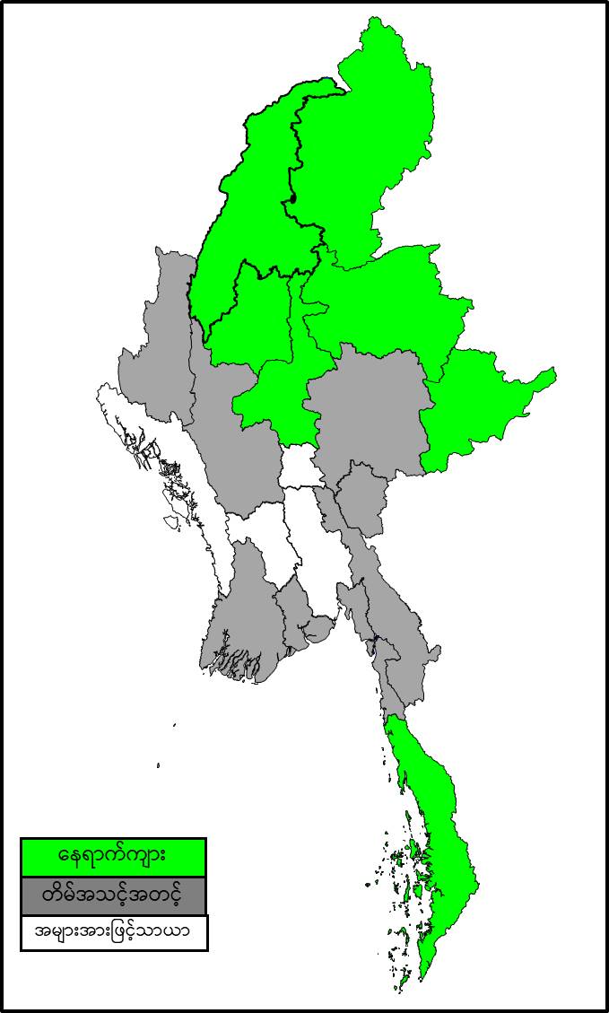 မနက်ဖြန်နံနက်အထိခန့်မှန်းချက်။ စစ်ကိုင်းတိုင်းဒေသကြီး၊ မန္တလေးတိုင်းဒေသကြီး၊ တနင်္သာရီတိုင်းဒေသကြီး၊ ကချင်ပြည်နယ်နှင့် ရှမ်းပြည်နယ် (မြောက်ပိုင်းနှင့် အရှေ့ပိုင်း)တို့တွင် နေရာကွက်ကျား မိုးအနည်းငယ် ထစ်ချုန်းရွာနိုင်ပါသည်။ ရွာရန်ရာနှုန်း(၆၀) ဖြစ်ပါသည်။ နေပြည်တော်၊ ပဲခူးတိုင်းဒေသကြီးနှင့် ရခိုင်ပြည်နယ်တို့တွင် အများအားဖြင့် သာယာပြီး၊ ကျန်တိုင်းဒေသကြီးနှင့် ပြည်နယ်တို့တွင် တိမ်အသင့်အတင့် ဖြစ်ထွန်းမည်။