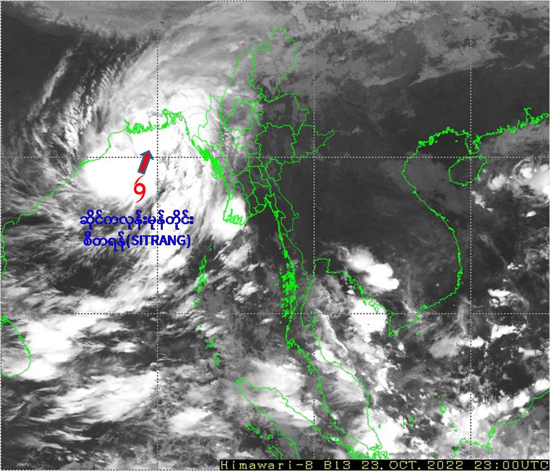 မိုးလေဝသနှင့်ဇလဗေဒညွှန်ကြားမှု ဦးစီးဌာနက ယနေ့နံနက် ထုတ်ပြန်သည့် မိုးလေဝသ သတင်းအရ ဘင်္ဂလားပင် လယ်အော်အနောက်အလယ်ပိုင်းနှင့် ယင်းနှင့်ဆက်စပ်လျက်ရှိသော ဘင်္ဂလားပင်လယ်အော် အရှေ့အလယ်ပိုင်းတို့တွင် ဖြစ်ပေါ်နေသောဆိုင်ကလုန်းမုန်တိုင်း (Cyclonic Storm) “စီတရန်(SITRANG)”သည် မြောက်-အရှေ့မြောက်ဘက်သို့ ရွေ့လျားခဲ့ပြီး၊ မြန်မာနိုင်ငံ၊ ဟိုင်းကြီးကျွန်းမြို့ (Hainggyikyun) ၏ အနောက်-အနောက်မြောက်ဘက် ရေမိုင်(၃၆၀)မိုင်ခန့်၊ သံတွဲမြို့ (Thandwe) ၏ အနောက်-အနောက်တောင်ဘက် ရေမိုင် (၃၄၀) မိုင်ခန့်၊ စစ်တွေမြို့ (Sittwe) ၏ အနောက်တောင်ဘက် ရေမိုင် (၂၉၅) မိုင်ခန့်၊ အိန္ဒိယနိုင်ငံ၊ ဆာဂါကျွန်း (Sagar Island) ၏ တောင်ဘက် ရေမိုင် (၂၄၀) မိုင်ခန့်နှင့် ဘင်္ဂလားဒေ့ရှ်နိုင်ငံ၊ ဘရာဆောမြို့ (Barisal)၏ တောင်-အနောက်တောင်ဘက် ရေမိုင် (၃၂၀) မိုင်ခန့်အကွာ ပင်လယ်ပြင်ကို ဗဟိုပြုနေသည်။ ကပ္ပလီပင်လယ်ပြင်နှင့် ဘင်္ဂလားပင်လယ်အော် တောင်ပိုင်းတို့တွင် တိမ်အသင့်အတင့်မှ တိမ်ထူထပ်နေပြီး၊ ကျန်ဘင်္ဂလားပင်လယ်အော်တွင် တိမ်ထူထပ်နေသည်။