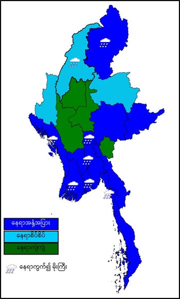 မနက်ဖြန်နံနက်အထိခန့်မှန်းချက်။ မန္တလေးတိုင်းဒေသကြီး၊ မကွေးတိုင်းဒေသကြီး၊ စစ်ကိုင်းတိုင်းဒေသကြီးအောက်ပိုင်းနှင့် ကယားပြည်နယ်တို့တွင် နေရာကျဲကျဲ၊ စစ်ကိုင်းတိုင်းဒေသကြီးအထက်ပိုင်း၊ ချင်းပြည်နယ်နှင့် ရှမ်းပြည်နယ်(မြောက်ပိုင်း)တို့တွင် နေရာစိပ်စိပ်နှင့် ကျန်တိုင်းဒေသကြီးနှင့် ပြည်နယ်တို့တွင် နေရာအနှံ့အပြား မိုးထစ်ချုန်းရွာပြီး၊ နေပြည်တော်၊ ရန်ကုန်တိုင်းဒေသကြီး၊ ပဲခူးတိုင်းဒေသကြီး၊ စစ်ကိုင်းတိုင်းဒေသကြီးအထက်ပိုင်း၊ ဧရာဝတီတိုင်းဒေသကြီး၊ ကချင်ပြည်နယ်၊ မွန်ပြည်နယ်နှင့် ရခိုင်ပြည်နယ်တို့တွင် နေရာကွက်၍ မိုးကြီးနိုင်ပါသည်။ ရွာရန်ရာနှုန်းပြည့် ဖြစ်ပါသည်။