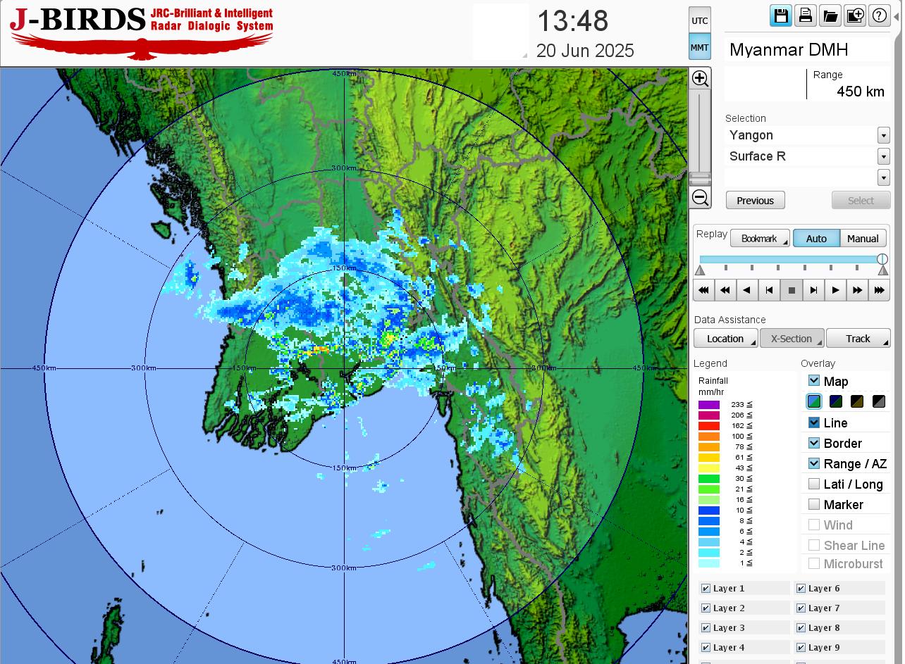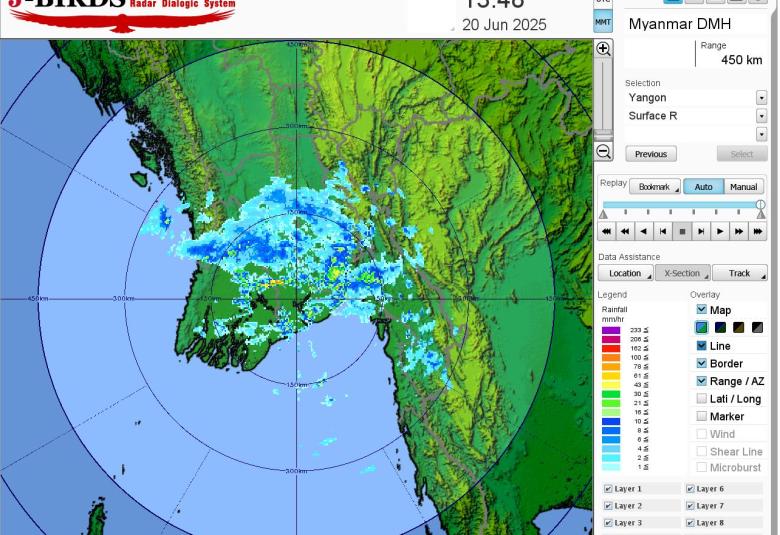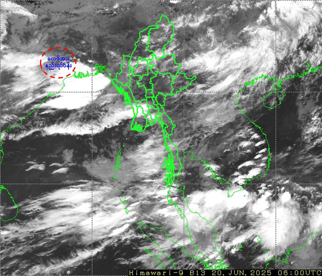 မိုးတိမ်တောင်ဖြစ်ပေါ်မှုအခြေအနေ။ ရန်ကုန်တိုင်းဒေသကြီး၊ ပဲခူးတိုင်းဒေသကြီး၊ စစ်ကိုင်းတိုင်းဒေသကြီးအထက်ပိုင်း၊ ဧရာဝတီတိုင်းဒေသကြီး၊ တနင်္သာရီတိုင်းဒေသကြီးနှင့် ရခိုင်ပြည်နယ်တို့တွင် မိုးတိမ်တောင်များ ဖြစ်ထွန်းလျက်ရှိပြီး၊ အဆိုပါ မိုးတိမ်တောင်များ ရွေ့လျားရာနေရာတစ်လျှောက်တွင် မိုးရွာသွန်းခြင်းနှင့်အတူ လေပြင်းတိုက်ခတ်ခြင်း၊ မိုးထစ်ချုန်းခြင်း၊ မိုးကြိုးပစ်ခြင်း၊ လျှပ်စီးလက်ခြင်းနှင့် မိုးသီးကြွေခြင်းစသည့် မိုးလေဝသဖြစ်စဉ်များ ဖြစ်ပေါ်နိုင်ပါသဖြင့် ကြိုတင်သတိပြုနိုင်ပါရန် အကြံပြုအပ်ပါသည်။