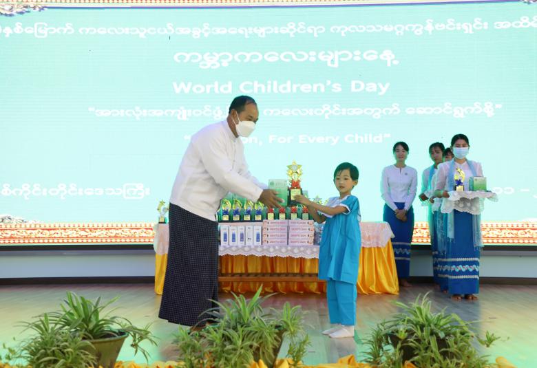 ထို့နောက် တိုင်းဒေသကြီး ဝန်ကြီးချုပ်က  ပုံပြင်၊ ကဗျာပြိုင်ပွဲများတွင် ပထမဆုရရှိသော ကလေးငယ်များကိုလည်းကောင်း၊ တိုင်းဒေသကြီး တရားသူကြီးချုပ်နှင့် လုံခြုံရေးနှင့် နယ်စပ်ရေးရာဝန်ကြီးတို့က ဒုတိယဆုရရှိသော ကလေးငယ်များကိုလည်းကောင်း၊ တိုင်းဒေသကြီးဝန်ကြီးများက တတိယဆုရရှိသော ကလေးငယ်များကိုလည်းကောင်း ဆုတံဆိပ်များ ပေးအပ်ချီးမြှင့်ကြပြီး တိုင်းဒေသကြီး အစိုးရအဖွဲ့ဝင်များက အခမ်းအနားသို့ တက်ရောက်လာကြသော ကလေးငယ်များကို လက်ဆောင်ပစ္စည်းများ ပေးအပ်ခဲ့ကြကြောင်း သိရသည်။
