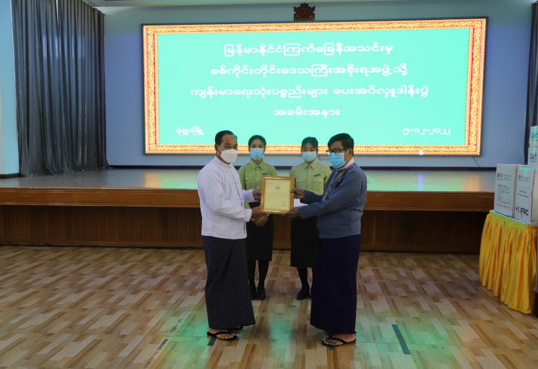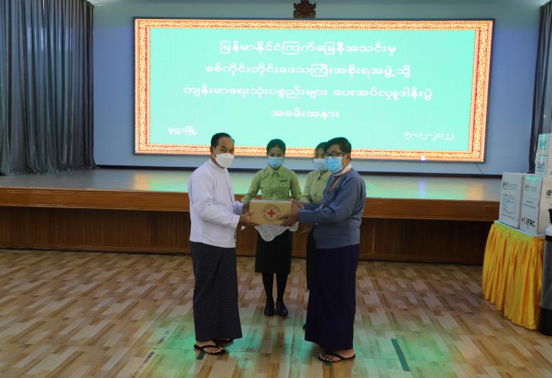 ယင်းနောက် ကျန်းမာရေးသုံးပစ္စည်းများ လှူဒါန်းရခြင်းနှင့် ပတ်သက်၍ တိုင်းဒေသကြီး ကြက်ခြေနီတပ်ဖွဲ့မှူးက ရှင်းလင်းတင်ပြပြီး တိုင်းဒေသကြီးဝန်ကြီးချုပ်ထံ မြန်မာနိုင်ငံ ကြက်ခြေ နီအသင်းကိုယ်စား တိုင်းဒေသကြီး ကြက်ခြေနီကြီးကြပ်မှုကော်မတီဥက္ကဋ္ဌက ကျန်းမာရေးသုံး ပစ္စည်းများ ပေးအပ်လှူဒါန်းသည်။