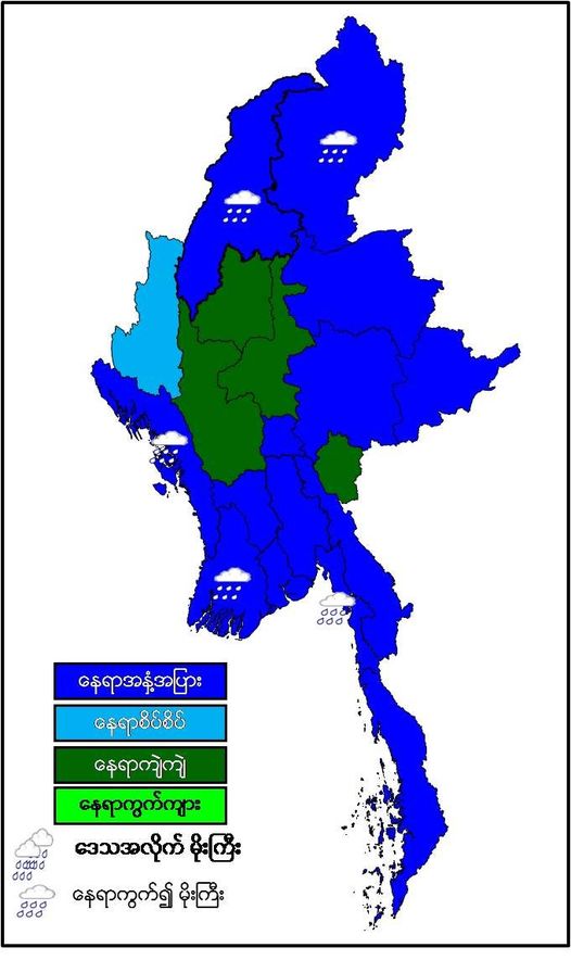 မနက်ဖြန်နံနက်အထိခန့်မှန်းချက်မှာ စစ်ကိုင်းတိုင်းဒေသကြီးအောက်ပိုင်း၊ မန္တလေးတိုင်းဒေသကြီး၊ မကွေးတိုင်းဒေသကြီးနှင့် ကယားပြည်နယ်တို့တွင် နေရာကျဲကျဲ၊ ချင်းပြည်နယ်တွင် နေရာစိပ်စိပ်နှင့် ကျန်တိုင်းဒေသကြီးနှင့် ပြည်နယ်တို့တွင် နေရာအနှံ့အပြားမိုးထစ်ချုန်းရွာပြီး စစ်ကိုင်းတိုင်းဒေသကြီး အထက်ပိုင်း၊ ဧရာဝတီတိုင်းဒေသကြီး၊ ကချင်ပြည်နယ်၊ ရခိုင်ပြည်နယ်နှင့် မွန်ပြည်နယ်တို့တွင် နေရာကွက်၍ မိုးကြီးနိုင်သည်။ ရွာရန်ရာနှုန်းပြည့် ဖြစ်သည်။
