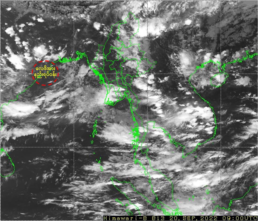 ဘင်္ဂလားပင်လယ်အော်အခြေအနေ။ ယနေ့မြန်မာစံတော်ချိန် (၁၅:၃၀)နာရီအချိန် တိုင်းထွာချက်များအရ ဘင်္ဂလားပင်လယ်အော်အနောက်မြောက်ပိုင်းနှင့် ယင်းနှင့်ဆက်စပ်လျက်ရှိသော အိန္ဒိယနိုင်ငံ၊ ဩရိဿပြည်နယ်မြောက်ပိုင်း-အနောက်ဘင်္ဂလားပြည်နယ်ကမ်းခြေတို့တွင် ဖြစ်ပေါ်နေသော လေဖိအားနည်းရပ်ဝန်း(Low Pressure Area)သည် ဆက်လက်တည်ရှိနေပါသည်။ အဆိုပါ လေဖိအားနည်းရပ်ဝန်း(Low Pressure Area)သည် အနောက်-အနောက်မြောက်ဘက်သို့ ရွေ့လျားပြီး၊ နောက်(၂)ရက်အတွင်း အိန္ဒိယနိုင်ငံ၊ ဩရိဿပြည်နယ်မြောက်ပိုင်းနှင့် ချက်တစ်ဂတ်ပြည်နယ်မြောက်ပိုင်းတို့မှ ဖြတ်ကျော်နိုင်သည်ဟု ခန့်မှန်းရပါသည်။ ကပ္ပလီပင်လယ်ပြင်နှင့် ဘင်္ဂလားပင်လယ်အော်တောင်ပိုင်းတို့တွင် မုတ်သုံလေ အားနည်းနေပြီး၊ ကျန်ဘင်္ဂလားပင်လယ်အော်တွင် မုတ်သုံလေ အားအသင့်အတင့် ရှိနေပါသည်။
