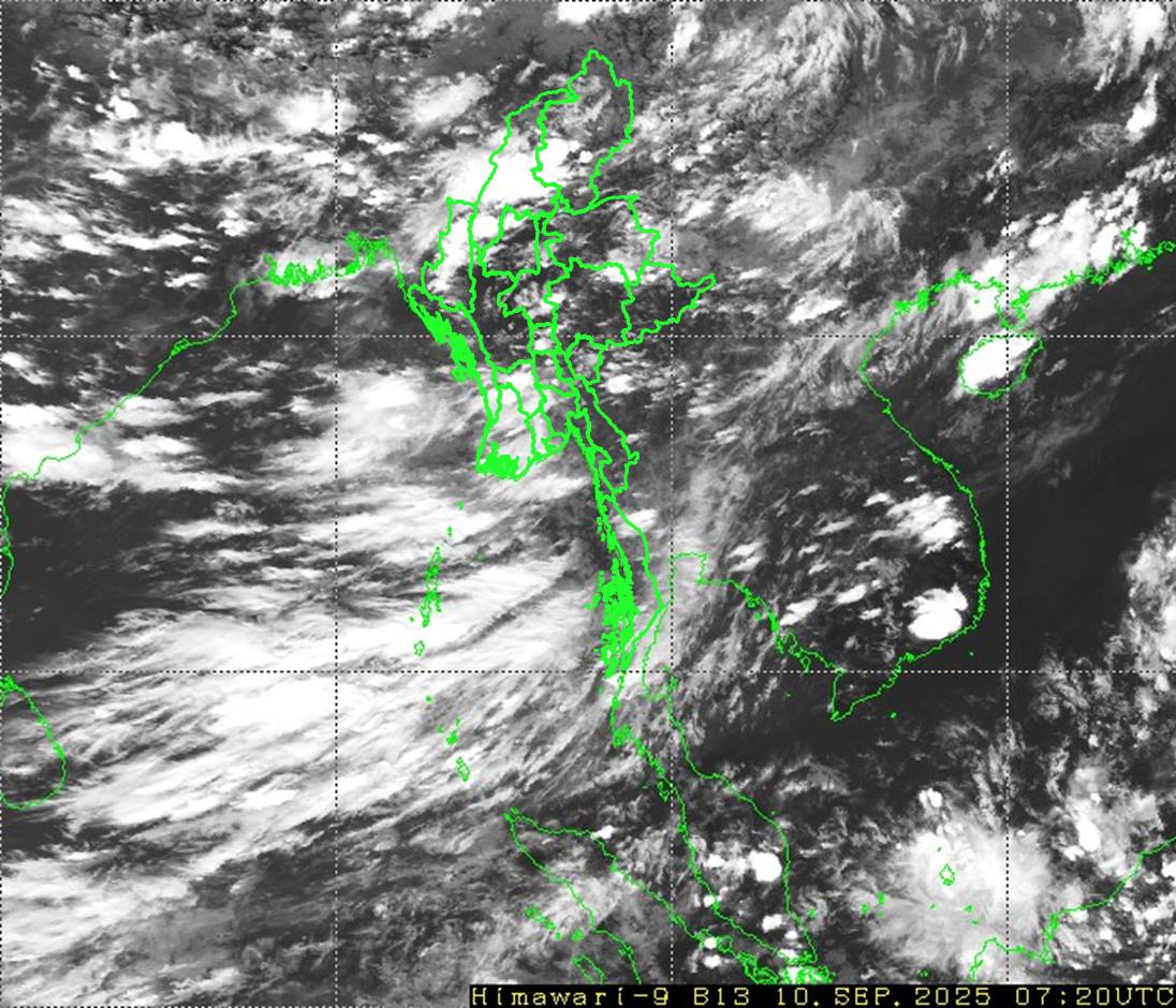 ယမန်နေ့နံနက် ၀၉:၃၀ နာရီအချိန်မှ ယနေ့နံနက် ၀၉:၃၀ နာရီအချိန်အထိ မိုးလေဝသတိုင်းထွာချက် အကျဉ်းချုပ်။ လွန်ခဲ့သော ၂၄ နာရီအတွင်းက မကွေးတိုင်းဒေသကြီး၊ ကယားပြည်နယ်နှင့် ရှမ်းပြည်နယ်(မြောက်ပိုင်း)တို့တွင် နေရာကွက်ကျား၊ စစ်ကိုင်းတိုင်းဒေသကြီးနှင့် ရခိုင်ပြည်နယ်တို့တွင် နေရာကျဲကျဲ၊ နေပြည်တော်၊ မန္တလေးတိုင်းဒေသကြီး၊ ကချင်ပြည်နယ်နှင့် ရှမ်းပြည်နယ်(အရှေ့ပိုင်း)တို့တွင် နေရာစိပ်စိပ်နှင့် ကျန်တိုင်းဒေသကြီးနှင့် ပြည်နယ်တို့တွင် နေရာအနှံ့အပြား မိုးထစ်ချုန်းရွာခဲ့ပြီး၊ မွန်ပြည်နယ်တွင် ဒေသအလိုက်နှင့် ရန်ကုန်တိုင်းဒေသကြီး၊ မန္တလေးတိုင်းဒေသကြီး၊ ပဲခူးတိုင်းဒေသကြီး၊ တနင်္သာရီတိုင်းဒေသကြီးနှင့် ကရင်ပြည်နယ်တို့တွင် နေရာကွက်၍ မိုးကြီးခဲ့ပါသည်။ မှတ်သားဖွယ်ရာ မိုးရေချိန်များမှာ ရွှေကျင်မြို့တွင် ၁၀.၇၁ လက်မ၊ မဒေါက်မြို့တွင် ၈.၄၇ လက်မ၊ ထားဝယ်မြို့တွင် ၇.၆၃ လက်မ၊ ကမမောင်းမြို့တွင် ၇.၀၅ လက်မ၊ ကျိုက္ခမီမြို့တွင် ၆.၃၄ လက်မ၊ ပေါင်မြို့တွင် ၄.၃၃ လက်မ၊ ဘားအံမြို့တွင် ၄.၀၅ လက်မ၊ ဘားအံ(စိုက်ပျိုးရေးမိုးလေဝသ)တွင် ၃.၆၅ လက်မ၊ ချောင်းဆုံမြို့တွင် ၃.၆၃ လက်မနှင့် ရေးမြို့တွင် ၃.၃၉ လက်မတို့ ဖြစ်ကြပါသည်။