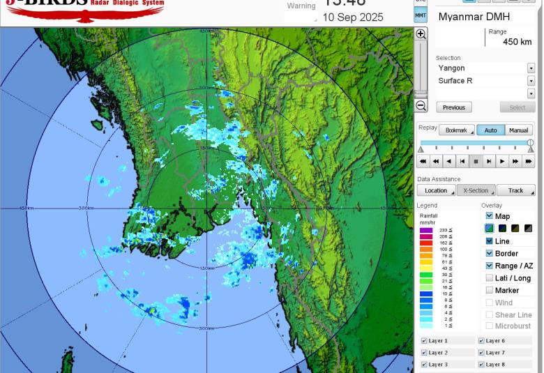 မိုးတိမ်တောင်ဖြစ်ပေါ်မှုအခြေအနေ။ ရန်ကုန်တိုင်းဒေသကြီး၊ မန္တလေးတိုင်းဒေသကြီး၊ ပဲခူးတိုင်းဒေသကြီး၊ စစ်ကိုင်းတိုင်းဒေသကြီး၊ ဧရာဝတီတိုင်းဒေသကြီး၊ ကချင်ပြည်နယ်၊ ချင်းပြည်နယ်၊ ရခိုင်ပြည်နယ်နှင့် ရှမ်းပြည်နယ်(မြောက်ပိုင်းနှင့်‌ တောင်ပိုင်း)တို့တွင် မိုးတိမ်တောင်များဖြစ်ထွန်းမှု အားကောင်းလျက်ရှိပြီး၊ အဆိုပါ မိုးတိမ်တောင်များ ရွေ့လျားရာနေရာတစ်လျှောက်တွင် မိုးရွာသွန်းခြင်းနှင့်အတူ လေပြင်းတိုက်ခတ်ခြင်း၊ မိုးထစ်ချုန်းခြင်း၊ မိုးကြိုးပစ်ခြင်း၊ လျှပ်စီးလက်ခြင်းနှင့် မိုးသီးကြွေခြင်းစသည့် မိုးလေဝသဖြစ်စဉ်များ ဖြစ်ပေါ်နိုင်ပါသဖြင့် ကြိုတင်သတိပြုနိုင်ပါရန် အကြံပြုအပ်ပါသည်။