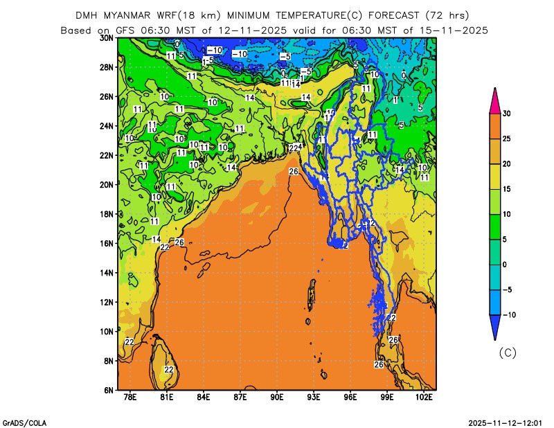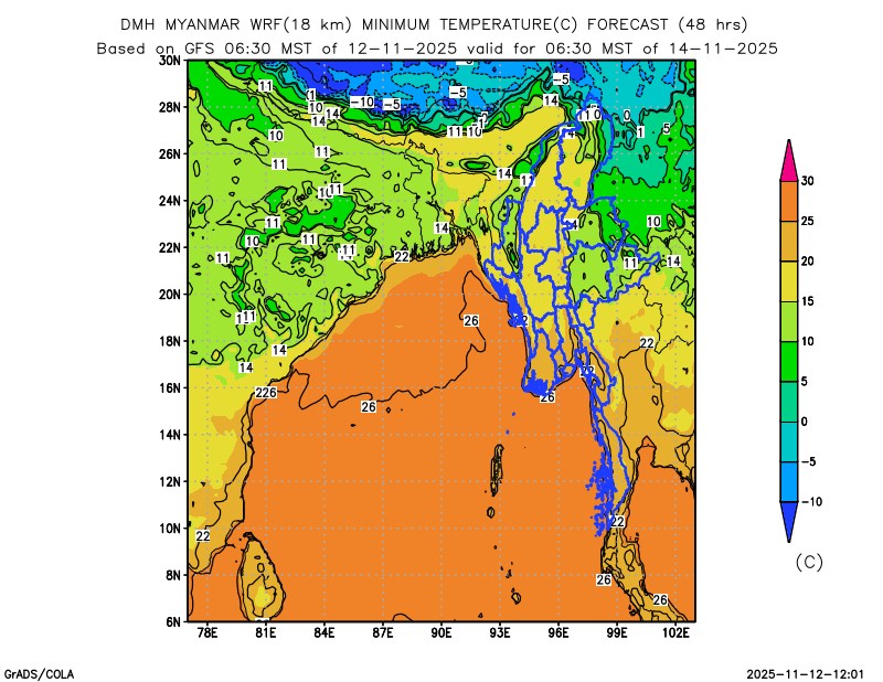 ယမန်နေ့နံနက် ၀၉:၃၀ နာရီအချိန်မှ ယနေ့နံနက် ၀၉:၃၀ နာရီအချိန်အထိ မိုးလေဝသတိုင်းထွာချက် အကျဉ်းချုပ်။ လွန်ခဲ့သော ၂၄ နာရီအတွင်းက ကရင်ပြည်နယ်တွင်‌ နေရာကျဲကျဲနှင့် နေပြည်တော်၊ ပဲခူးတိုင်းဒေသကြီး၊ တနင်္သာရီတိုင်းဒေသကြီး၊ ကချင်ပြည်နယ်နှင့် မွန်ပြည်နယ်တို့တွင် နေရာကွက်ကျား မိုးထစ်ချုန်းရွာခဲ့ပြီး၊ ကျန်တိုင်းဒေသကြီးနှင့် ပြည်နယ်တို့တွင် တိမ်အသင့်အတင့် ဖြစ်ထွန်းခဲ့ပါသည်။ ညအပူချိန်များမှာ ချင်းပြည်နယ်တွင် နိုဝင်ဘာလ၏ ပျမ်းမျှအပူချိန်အောက် ၆ ဒီဂရီဆဲလ်စီးယပ်နှင့် ရှမ်းပြည်နယ်(မြောက်ပိုင်း)တွင် နိုဝင်ဘာလ၏ ပျမ်းမျှအပူချိန်အောက် ၂ ဒီဂရီဆဲလ်စီးယပ် လျော့နည်းခဲ့ပြီး၊ ကချင်ပြည်နယ်တွင် နိုဝင်ဘာလ၏ ပျမ်းမျှအပူချိန်ထက် ၄ ဒီဂရီဆဲလ်စီးယပ်ပိုခဲ့ကာ ကျန်တိုင်းဒေသကြီးနှင့် ပြည်နယ်တို့တွင် နိုဝင်ဘာလ၏ ပျမ်းမျှအပူချိန်ခန့်သာ ရှိခဲ့ပါသည်။ ထူးခြားသည့် ညအပူချိန်များမှာ ဟားခါးမြို့တွင် ၂.၀ ဒီဂရီဆဲလ်စီးယပ်၊ လွိုင်လင်မြို့တွင် ၇.၆ ဒီဂရီဆဲလ်စီးယပ်၊ နမ့်စန်မြို့(ရှမ်းပြည်နယ်တောင်ပိုင်း)တွင် ၉.၄ ဒီဂရီဆဲလ်စီးယပ်၊ ပင်လောင်းမြို့တွင် ၁၀.၃ ဒီဂရီဆဲလ်စီးယပ်၊ ဟဲဟိုးမြို့တွင် ၁၁.၂ ဒီဂရီဆဲလ်စီးယပ်၊ တောင်ကြီးမြို့တွင် ၁၁.၃ ဒီဂရီဆဲလ်စီးယပ်နှင့် ပြင်ဦးလွင်မြို့တွင် ၁၁.၇ ဒီဂရီဆဲလ်စီးယပ်တို့ ဖြစ်ကြပါသည်။ မှတ်သားဖွယ်ရာ မိုးရေချိန်များမှာ ပူတာအိုမြို့တွင် ၀.၈၃ လက်မ၊ ကော့သောင်းမြို့တွင် ၀.၀၈ လက်မနှင့် သထုံမြို့တွင် ၀.၀၄ လက်မတို့ ဖြစ်ကြပါသည်။