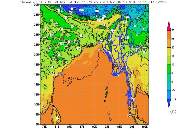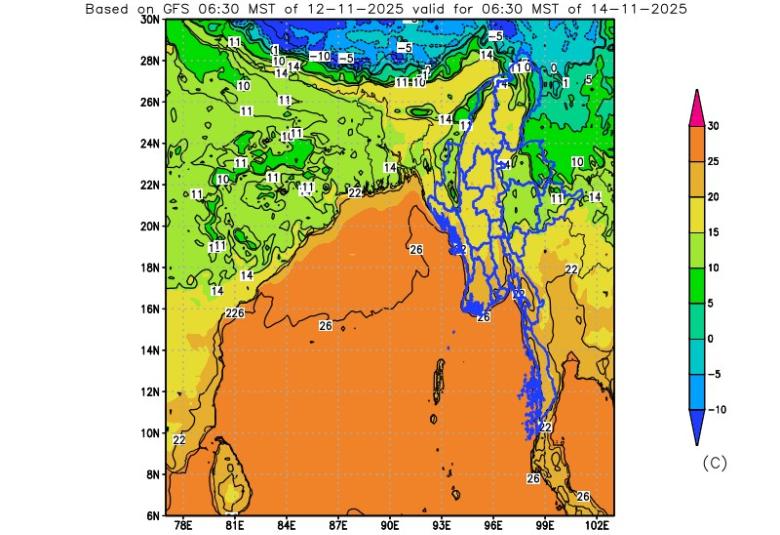 နောက် ၂ ရက်အတွက်ခန့်မှန်းချက်။ စစ်ကိုင်းတိုင်းဒေသကြီးအထက်ပိုင်း၊ ကချင်ပြည်နယ်၊ ချင်းပြည်နယ်နှင့် ရှမ်းပြည်နယ်တို့တွင် ညအပူချိန်များ အနည်းငယ် လျော့နည်းနိုင်ပါသည်။