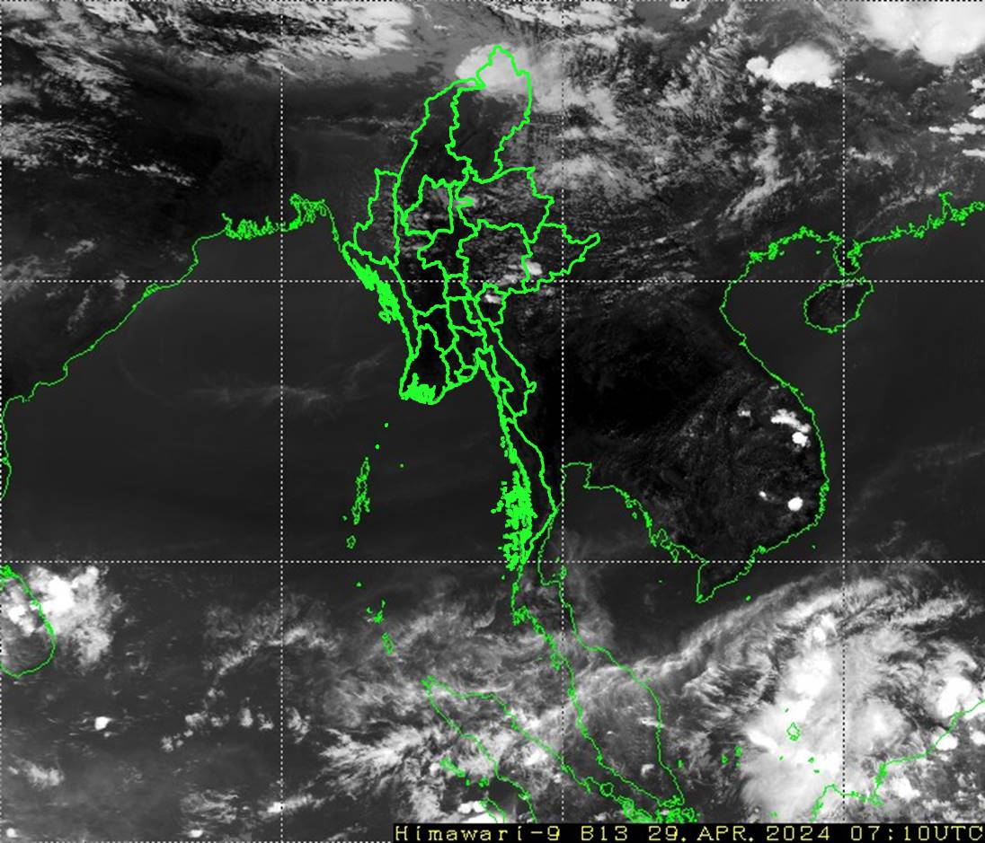 ယမန်နေ့နံနက်(၀၉:၃၀)နာရီအချိန်မှ ယနေ့နံနက်(၀၉:၃၀)နာရီအချိန်အထိ မိုးလေဝသ တိုင်းထွာချက် အကျဉ်းချုပ်။ လွန်ခဲ့သော (၂၄)နာရီအတွင်းက ကချင်ပြည်နယ်တွင် နေရာကျဲကျဲနှင့် စစ်ကိုင်းတိုင်းဒေသကြီးအထက်ပိုင်းနှင့် မွန်ပြည်နယ်တို့တွင် နေရာကွက်ကျား မိုးထစ်ချုန်းရွာခဲ့ပြီး၊ ကျန်တိုင်းဒေသကြီးနှင့် ပြည်နယ်တို့တွင် တိမ်အသင့်အတင့် ဖြစ်ထွန်းခဲ့ပါသည်။ နေ့အပူချိန်များမှာ စစ်ကိုင်းတိုင်းဒေသကြီး၊ မန္တလေးတိုင်းဒေသကြီး၊ မကွေးတိုင်းဒေသကြီးနှင့် ရှမ်းပြည်နယ်တို့တွင် ဧပြီလ၏ ပျမ်းမျှအပူချိန်တို့ထက် ၅ ဒီဂရီဆဲလ်စီးယပ်မှ ၆ ဒီဂရီဆဲလ်စီးယပ်အထိ၊ နေပြည်တော်၊ ပဲခူးတိုင်းဒေသကြီး၊ ဧရာဝတီတိုင်းဒေသကြီး၊ တနင်္သာရီတိုင်းဒေသကြီးနှင့် ချင်းပြည်နယ်တို့တွင် ဧပြီလ၏ ပျမ်းမျှအပူချိန်တို့ထက် ၃ ဒီဂရီဆဲလ်စီးယပ် မှ ၄ ဒီဂရီဆဲလ်စီးယပ်အထိနှင့် ရန်ကုန်တိုင်းဒေသကြီး၊ ရခိုင်ပြည်နယ်၊ ကယားပြည်နယ်၊ ကရင်ပြည်နယ်နှင့် မွန်ပြည်နယ်တို့တွင် ဧပြီလ၏ ပျမ်းမျှအပူချိန်တို့ထက် ၂ ဒီဂရီဆဲလ်စီးယပ်ပိုခဲ့ပြီး၊ ကချင်ပြည်နယ်တွင် ဧပြီလ၏ ပျမ်းမျှအပူချိန်ခန့်သာ ရှိခဲ့ပါသည်။ ၂၈-၄-၂၀၂၄ ရက်နေ့တွင် ဖြစ်ပေါ်ခဲ့သော ထူးခြားသည့် နေ့အပူချိန်များမှာ ချောက်မြို့တွင် ၄၈.၂ ဒီဂရီဆဲလ်စီးယပ်၊ မကွေးမြို့တွင် ၄၆.၁ ဒီဂရီဆဲလ်စီးယပ်၊ မြင်းခြံမြို့နှင့် ညောင်ဦးမြို့တို့တွင် ၄၆.၀ ဒီဂရီဆဲလ်စီးယပ်စီ၊ မြင်းမူမြို့တွင် ၄၅.၆ ဒီဂရီဆဲလ်စီးယပ်၊ စစ်ကိုင်းမြို့၊ တံတားဦး(လေကြောင်းမိုးလေဝသ)နှင့် မင်းဘူးမြို့တို့တွင် ၄၅.၅ ဒီဂရီဆဲလ်စီးယပ်စီ၊ အောင်လံမြို့တွင် ၄၅.၃ ဒီဂရီဆဲလ်စီးယပ်နှင့် တောင်တွင်းကြီးမြို့တွင် ၄၅.၀ ဒီဂရီဆဲလ်စီးယပ်တို့ ဖြစ်ကြပါသည်။ မှတ်သားဖွယ်ရာ မိုးရေချိန်များမှာ ပူတာအိုမြို့တွင် ၀.၆၀ လက်မနှင့် မချမ်းဘောမြို့တွင် ၀.၄၃ လက်မတို့ ဖြစ်ကြပါသည်။